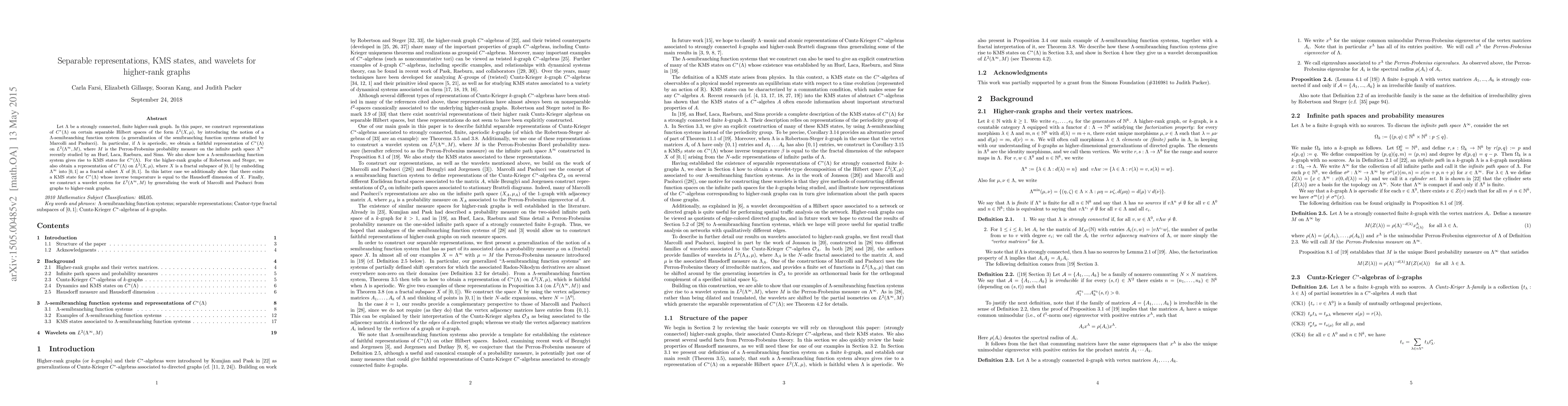 Let $\Lambda$ be a strongly connected, finite higher-rank graph. In this paper, we construct representations of $C^*(\Lambda)$ on certain separable Hilbert spaces of the form $L^2(X,\mu)$, by introducing the notion of a $\Lambda$-semibranching function system (a generalization of the semibranching function systems studied by Marcolli and Paolucci). In particular, when $\Lambda$ is aperiodic, we obtain a faithful representation of $C^*(\Lambda)$ on $L^2(\Lambda^\infty, M)$, where $M$ is the Perron-Frobenius probability measure on the infinite path space $\Lambda^\infty$ recently studied by an Huef, Laca, Raeburn, and Sims. We also show how a $\Lambda$-semibranching function system gives rise to KMS states for $C^*(\Lambda)$. For the higher-rank graphs of Robertson and Steger, we also obtain a representation of $C^*(\Lambda)$ on $L^2(X, \mu)$, where $X$ is a fractal subspace of $[0,1]$ by embedding $\Lambda^{\infty}$ into $[0,1]$ as a fractal subset $X$ of $[0,1]$. In this latter case we additionally show that there exists a KMS state for $C^*(\Lambda)$ whose inverse temperature is equal to the Hausdorff dimension of $X$. Finally, we construct a wavelet system for $L^2(\Lambda^\infty, M)$ by generalizing the work of Marcolli and Paolucci from graphs to higher-rank graphs.