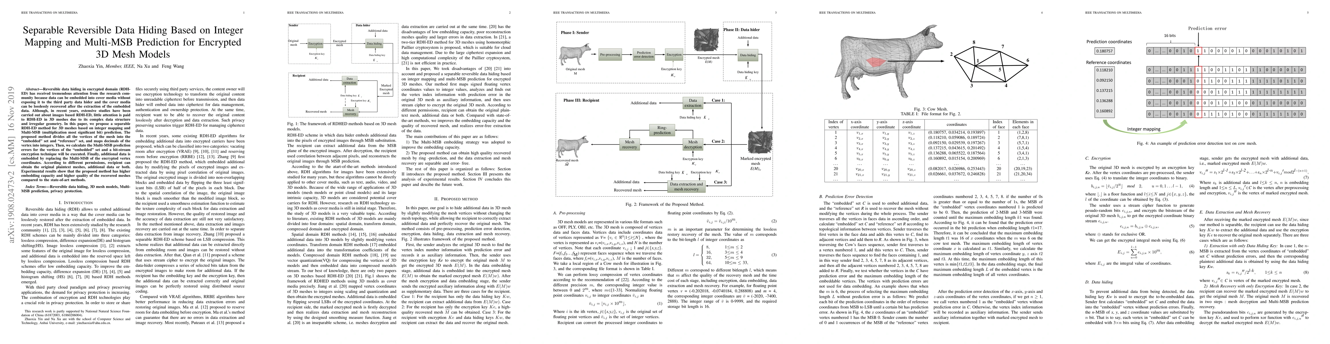 This paper proposes a separable reversible data hiding method for encrypted 3D mesh models using integer mapping and Multi-MSB prediction. The method divides mesh vertices into embedded and reference sets, maps vertex decimals to integers, and embeds data by altering the Multi-MSB of encrypted vertex coordinates, allowing for lossless recovery and varying data retrieval permissions.