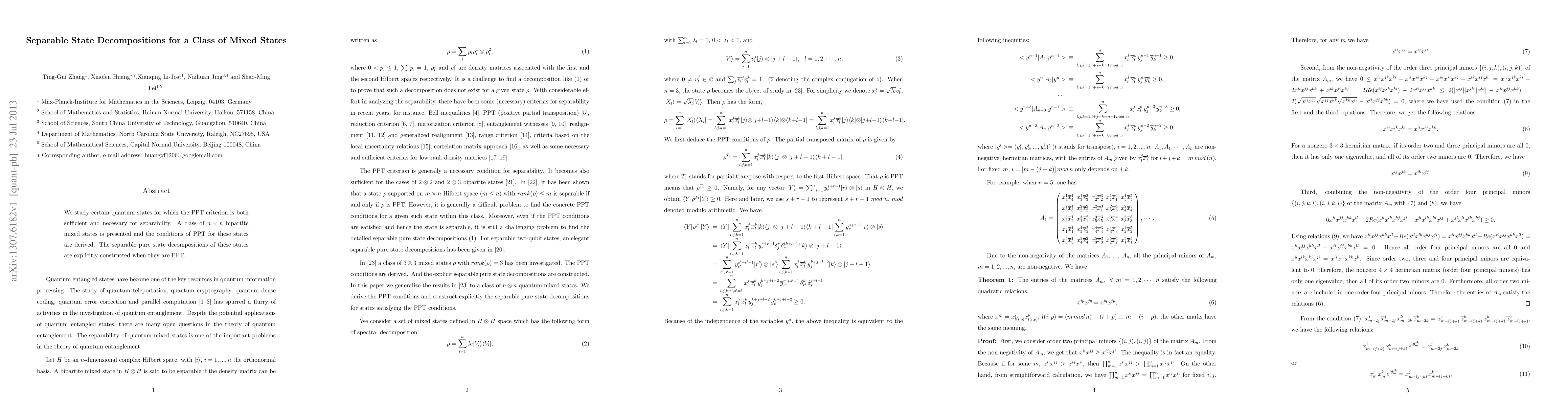 This paper investigates a class of $n\times n$ bipartite mixed quantum states where the PPT criterion is both necessary and sufficient for separability. It derives the conditions for PPT and constructs explicit separable pure state decompositions for these states when they are PPT.