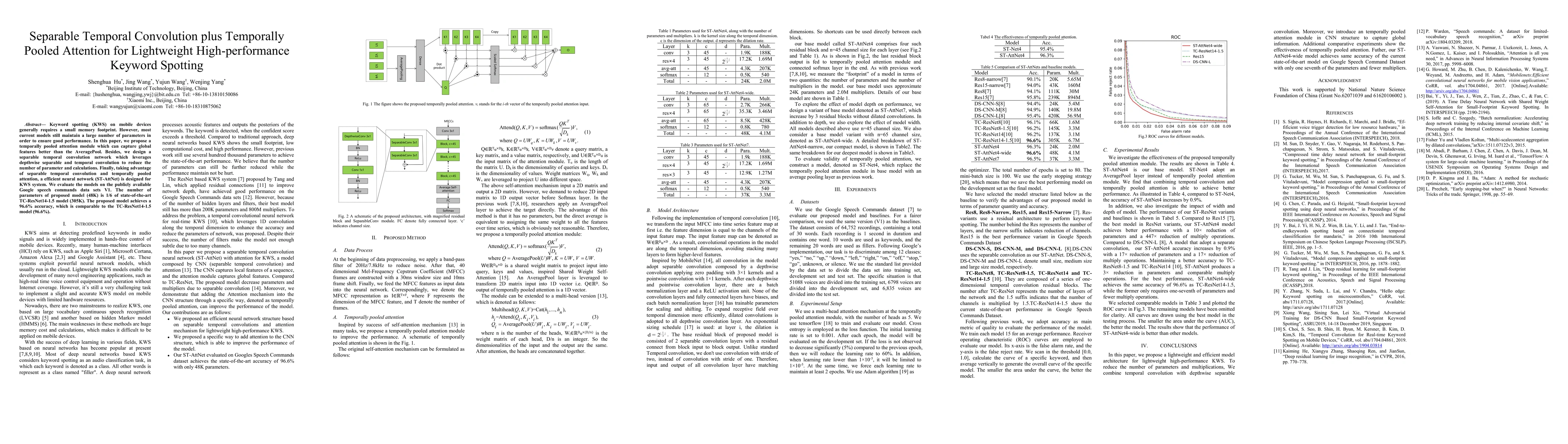 Keyword spotting (KWS) on mobile devices generally requires a small memory footprint. However, most current models still maintain a large number of parameters in order to ensure good performance. In this paper, we propose a temporally pooled attention module which can capture global features better than the AveragePool. Besides, we design a separable temporal convolution network which leverages depthwise separable and temporal convolution to reduce the number of parameter and calculations. Finally, taking advantage of separable temporal convolution and temporally pooled attention, a efficient neural network (ST-AttNet) is designed for KWS system. We evaluate the models on the publicly available Google speech commands data sets V1. The number of parameters of proposed model (48K) is 1/6 of state-of-the-art TC-ResNet14-1.5 model (305K). The proposed model achieves a 96.6% accuracy, which is comparable to the TC-ResNet14-1.5 model (96.6%).
