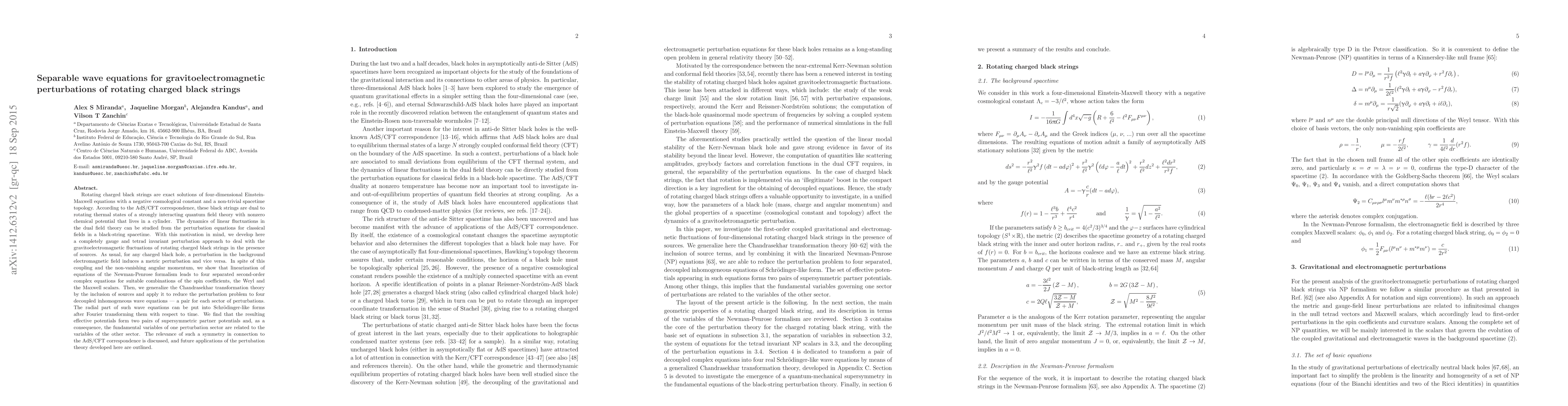 Rotating charged black strings are solutions of four-dimensional Einstein-Maxwell equations with a negative cosmological constant and a non-trivial topology. According to the AdS/CFT correspondence, these black strings are dual to rotating thermal states of a strongly interacting field theory with nonzero chemical potential that lives in a cylinder. The dynamics of fluctuations in the field theory can be studied from the perturbation equations for classical fields in a black-string spacetime. With this motivation in mind, we develop here a completely gauge and tetrad invariant perturbation approach to deal with the gravitoelectromagnetic fluctuations of rotating charged black strings in the presence of sources. As usual, for any charged black hole, a perturbation in the background electromagnetic field induces a metric perturbation and vice versa. In spite of this coupling and the non-vanishing angular momentum, we show that linearization of equations of the Newman-Penrose formalism leads to four separated second-order complex equations for suitable combinations of the spin coefficients, the Weyl and the Maxwell scalars. Then, we generalize the Chandrasekhar transformation theory by the inclusion of sources and apply it to reduce the perturbation problem to four decoupled inhomogeneous wave equations --- a pair for each sector of perturbations. The radial part of such wave equations can be put into Schrodinger-like forms after Fourier transforming them with respect to time. We find that the resulting effective potentials form two pairs of supersymmetric partner potentials and, as a consequence, the fundamental variables of one perturbation sector are related to the variables of the other sector. The relevance of such a symmetry in connection to the AdS/CFT correspondence is discussed, and future applications of the pertubation theory developed here are outlined.