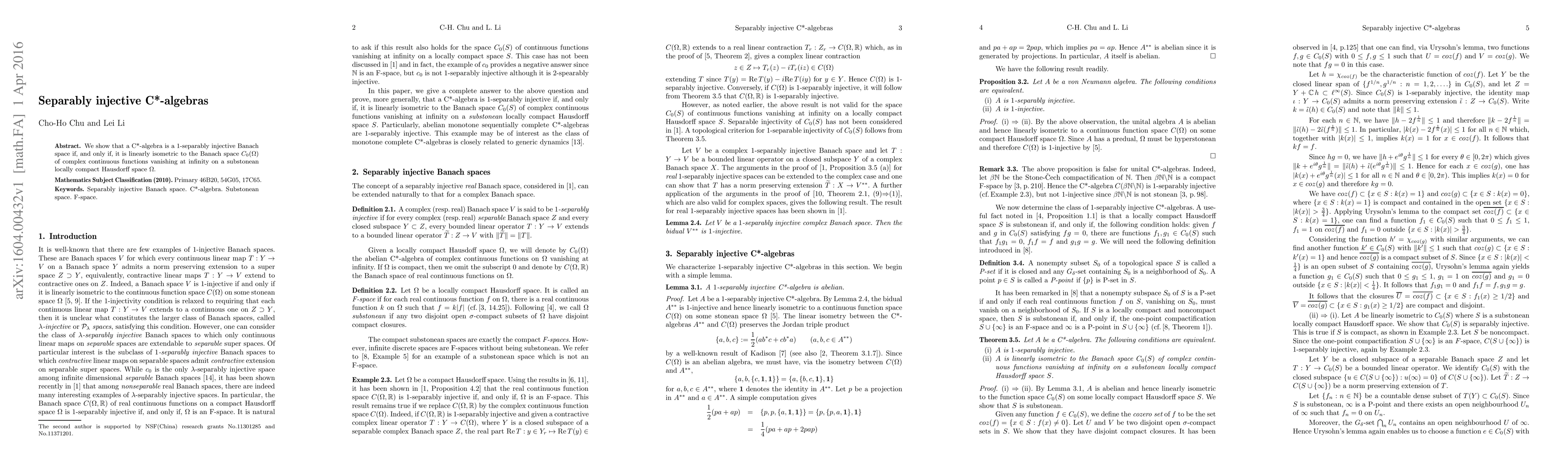 Summary: The paper establishes that a C*-algebra is $1$-separably injective if and only if it is isometrically isomorphic to the Banach space $C_0(\Omega)$, where $\Omega$ is a substonean locally compact Hausdorff space. This characterizes the separably injective C*-algebras in terms of continuous functions on such spaces.