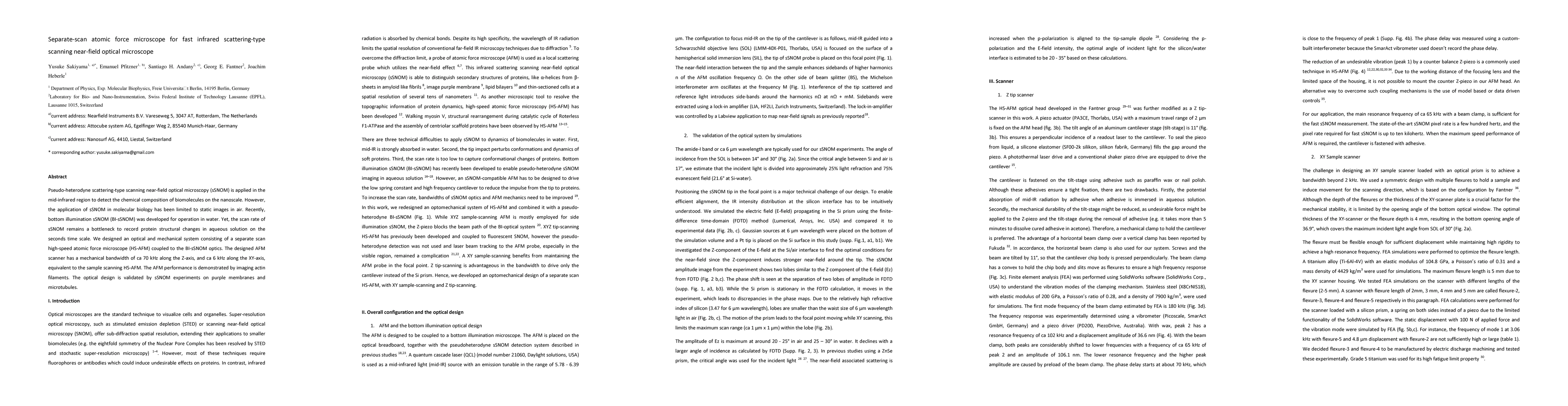 Pseudo-heterodyne scattering-type scanning near-field optical microscopy (sSNOM) is applied in the mid-infrared region to detect the chemical composition of biomolecules on the nanoscale. However, the application of sSNOM in molecular biology has been limited to static images in air. Recently, bottom illumination sSNOM (BI-sSNOM) was developed for operation in water. Yet, the scan rate of sSNOM remains a bottleneck to record protein structural changes in aqueous solution on the seconds time scale. We designed an optical and mechanical system consisting of a separate scan high-speed atomic force microscope (HS-AFM) coupled to the BI-sSNOM optics. The designed AFM scanner has a mechanical bandwidth of ca 70 kHz along the Z-axis, and ca 6 kHz along the XY-axis, equivalent to the sample scanning HS-AFM. The AFM performance is demonstrated by imaging actin filaments. The optical design is validated by sSNOM experiments on purple membranes and microtubules.