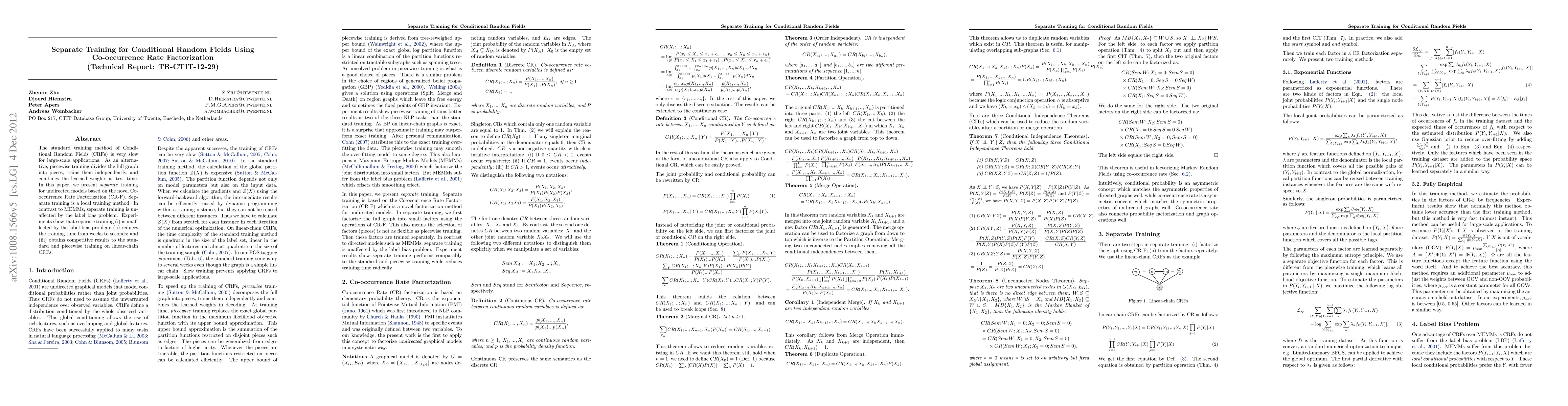 A new training method for Conditional Random Fields called separate training uses Co-occurrence Rate Factorization to speed up training from weeks to seconds, while maintaining competitive results.