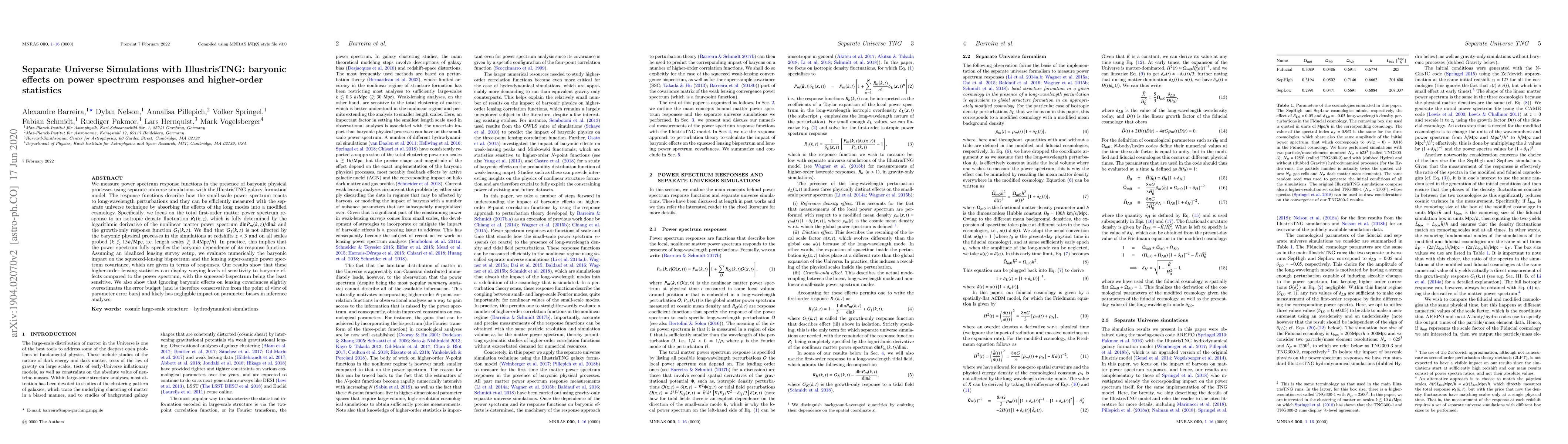 This paper investigates the impact of baryonic processes on the power spectrum response functions using separate universe simulations with IllustrisTNG. It finds that baryonic effects do not influence the growth-only response function at redshifts below 3, implying the power spectrum alone can determine baryonic dependencies. Higher-order lensing statistics show varying sensitivity to baryonic effects, with the squeezed-lensing bispectrum being the least affected.