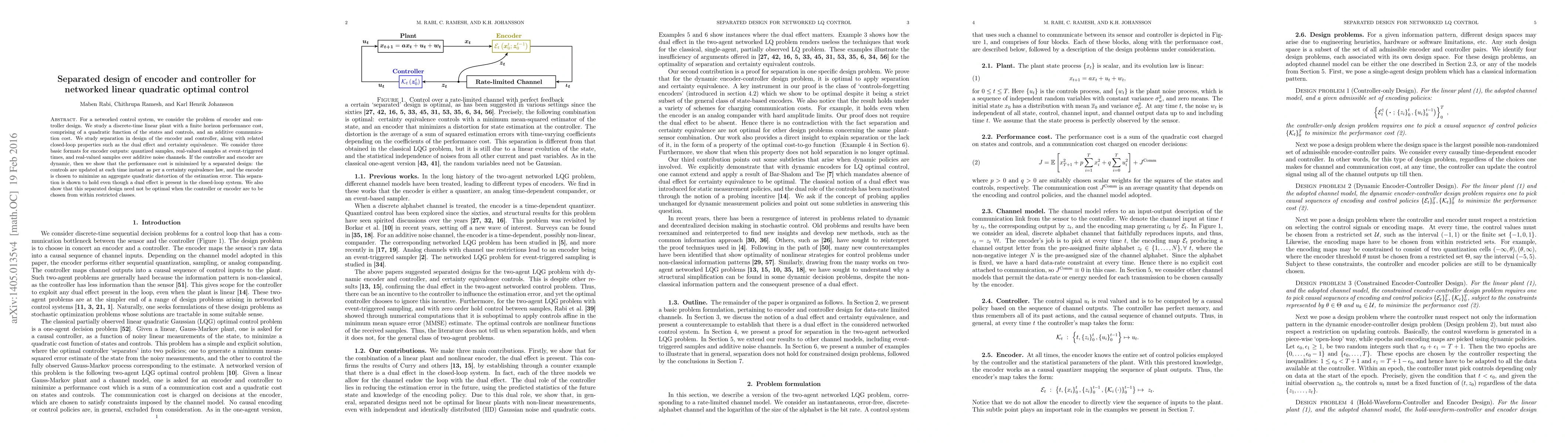 For a networked control system, we consider the problem of encoder and controller design. We study a discrete-time linear plant with a finite horizon performance cost, comprising of a quadratic function of the states and controls, and an additive communication cost. We study separation in design of the encoder and controller, along with related closed-loop properties such as the dual effect and certainty equivalence. We consider three basic formats for encoder outputs: quantized samples, real-valued samples at event-triggered times, and real-valued samples over additive noise channels. If the controller and encoder are dynamic, then we show that the performance cost is minimized by a separated design: the controls are updated at each time instant as per a certainty equivalence law, and the encoder is chosen to minimize an aggregate quadratic distortion of the estimation error. This separation is shown to hold even though a dual effect is present in the closed-loop system. We also show that this separated design need not be optimal when the controller or encoder are to be chosen from within restricted classes.