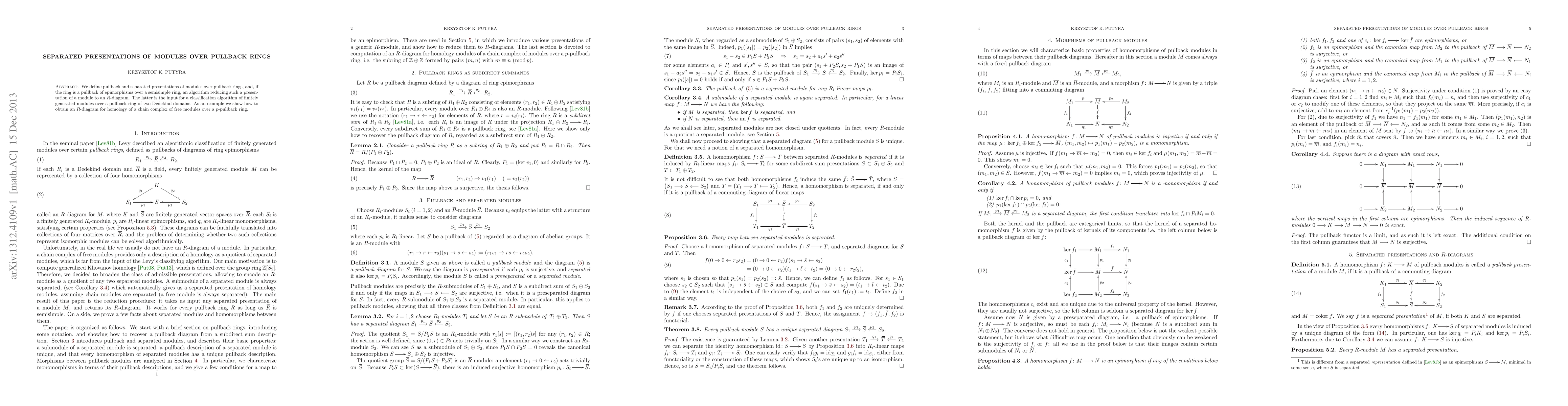 We define pullback and separated presentations of modules over pullback rings, and, if the ring is a pullback of epimorphisms over a semisimple ring, an algorithm reducing such a presentation of a module to an $R$-diagram. The latter is the input for a classification algorithm of finitely generated modules over a pullback ring of two Dedekind domains. As an example we show how to obtain an $R$-diagram for homology of a chain complex of free modules over a $p$-pullback ring.
