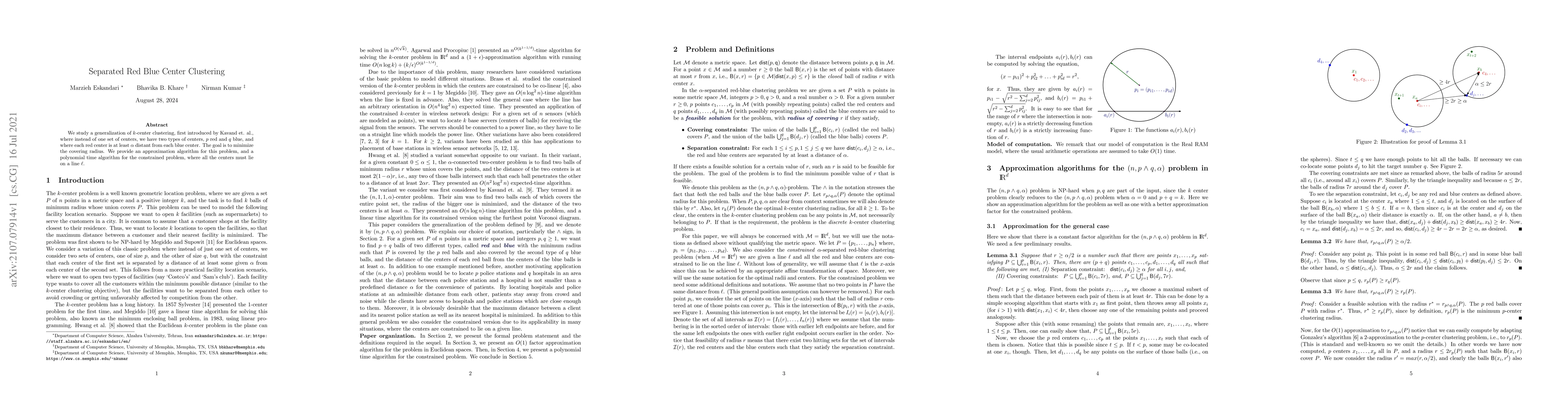 This paper generalizes $k$-center clustering with two types of centers—red and blue—where each red center must be at least $\alpha$ distant from any blue center. It presents an approximation algorithm for the problem and a polynomial time algorithm for the constrained version where all centers lie on a line.