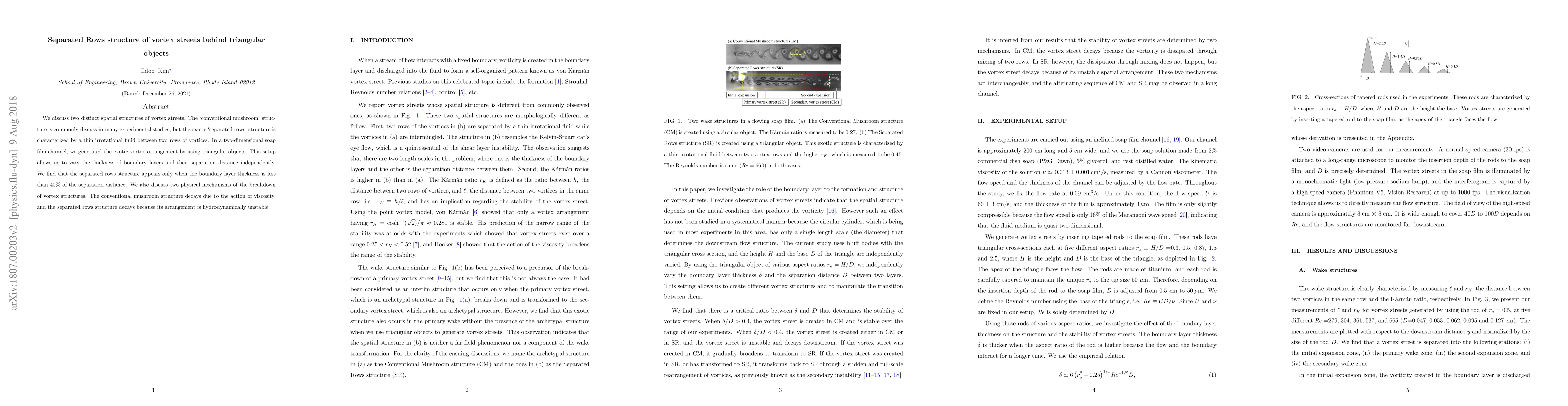 Researchers found a new vortex structure behind triangular objects in water, called separated rows, which appears only under specific conditions. This structure is more unstable than the traditional mushroom shape and breaks down due to hydrodynamic instability.