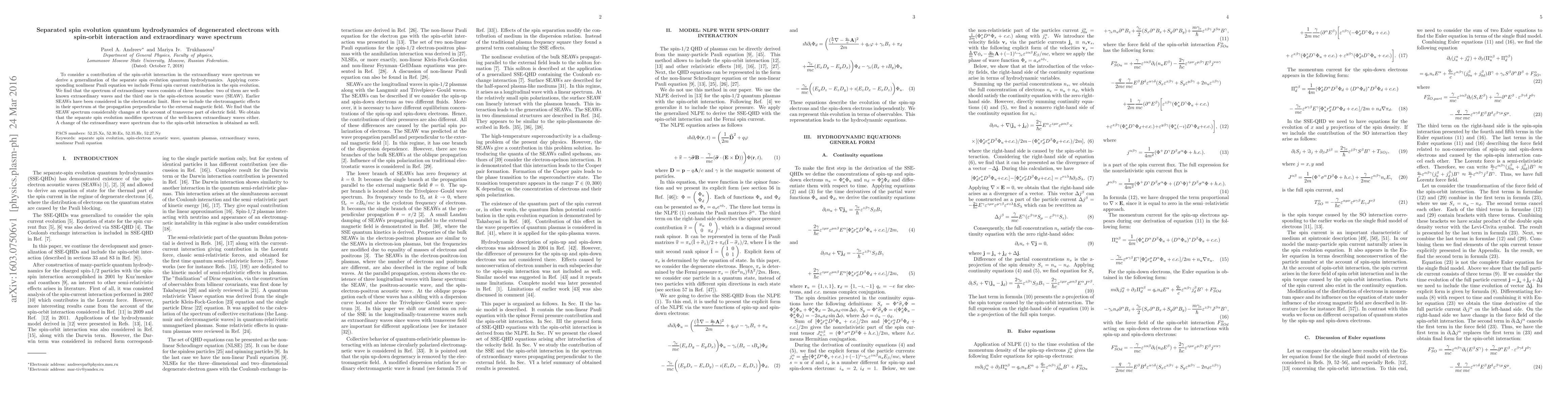 To consider a contribution of the spin-orbit interaction in the extraordinary wave spectrum we derive a generalization of the separate spin evolution quantum hydrodynamics. Applying corresponding nonlinear Pauli equation we include Fermi spin current contribution in the spin evolution. We find that the spectrum of extraordinary waves consists of three branches: two of them are well-known extraordinary waves and the third one is the spin-electron acoustic wave (SEAW). Earlier SEAWs have been considered in the electrostatic limit. Here we include the electromagnetic effects in their spectrum at the propagation perpendicular to the external magnetic field. We find that the SEAW spectrum considerably changes at the account of transverse part of electric field. We obtain that the separate spin evolution modifies spectrum of the well-known extraordinary waves either. A change of the extraordinary wave spectrum due to the spin-orbit interaction is obtained as well.