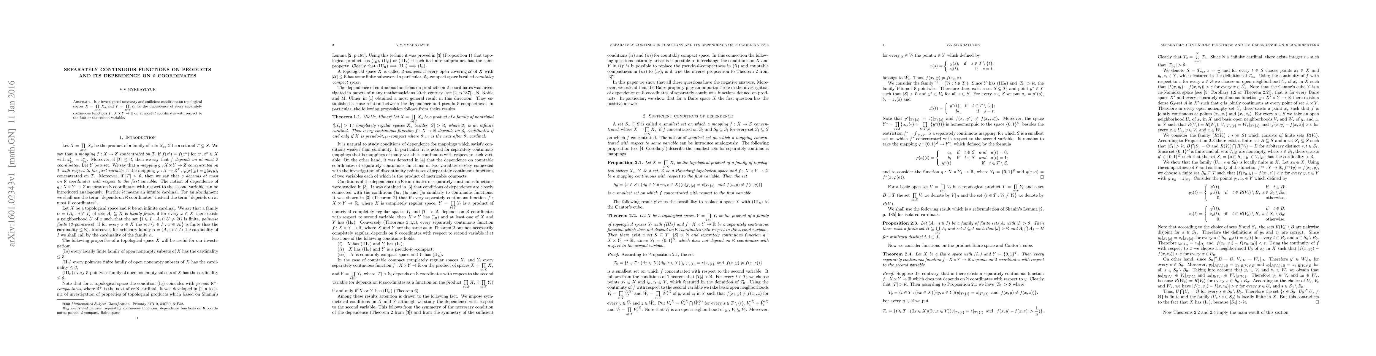 It is investigated necessary and sufficient conditions on topological spaces $X=\prod\limits _{s\in S}X_s$ and $Y=\prod\limits _{t\in T}Y_t$ for the dependence of every separately continuous functions $f:X\times Y\to \mathbb R$ on at most $\aleph$ coordinates with respect to the first or the second variable.