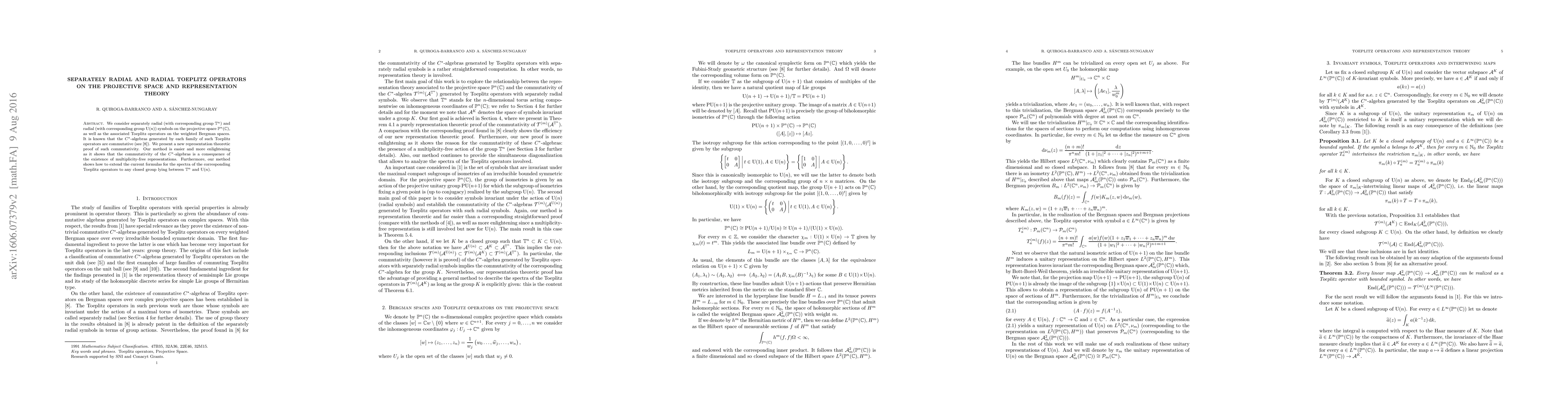 We consider separately radial (with corresponding group $\mathbb{T}^n$) and radial (with corresponding group $\mathrm{U}(n))$ symbols on the projective space $\mathbb{P}^n(\mathbb{C})$, as well as the associated Toeplitz operators on the weighted Bergman spaces. It is known that the $C^*$-algebras generated by each family of such Toeplitz operators are commutative. We present a new representation theoretic proof of such commutativity. Our method is easier and more enlightening as it shows that the commutativity of the $C^*$-algebras is a consequence of the existence of multiplicity-free representations. Furthermore, our method shows how to extend the current formulas for the spectra of the corresponding Toeplitz operators to any closed group lying between $\mathbb{T}^n$ and $\mathrm{U}(n)$.