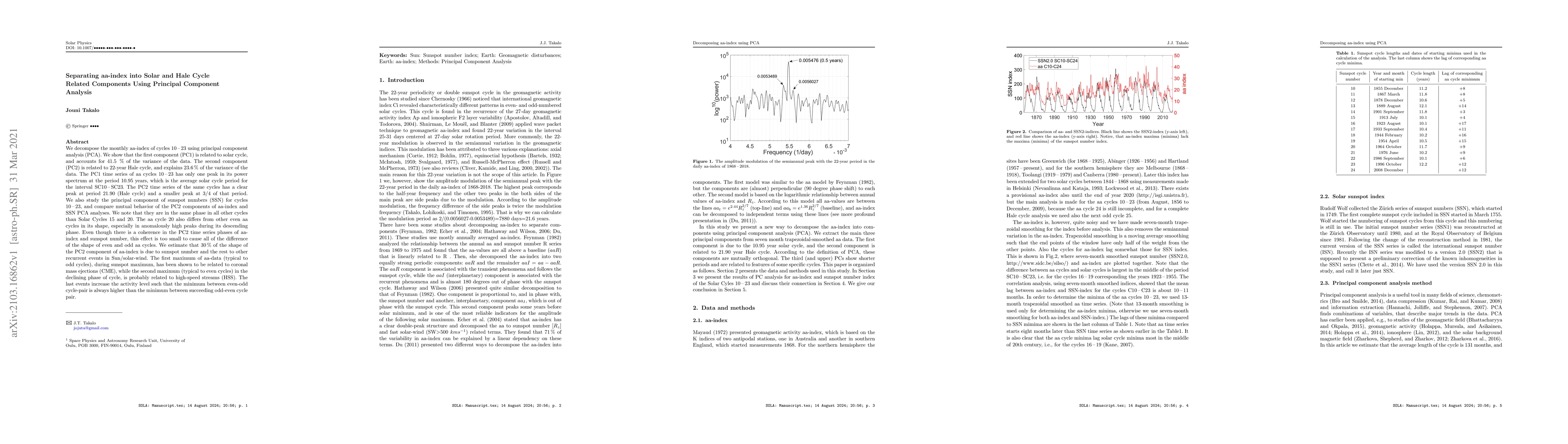 This paper uses PCA to decompose the aa-index into solar cycle and Hale cycle components, finding that PC1 correlates with the solar cycle and PC2 with the Hale cycle. The study also notes a 30% influence of sunspot numbers on the shape of the PC2 component, with other factors contributing to the differences in even and odd aa cycles.