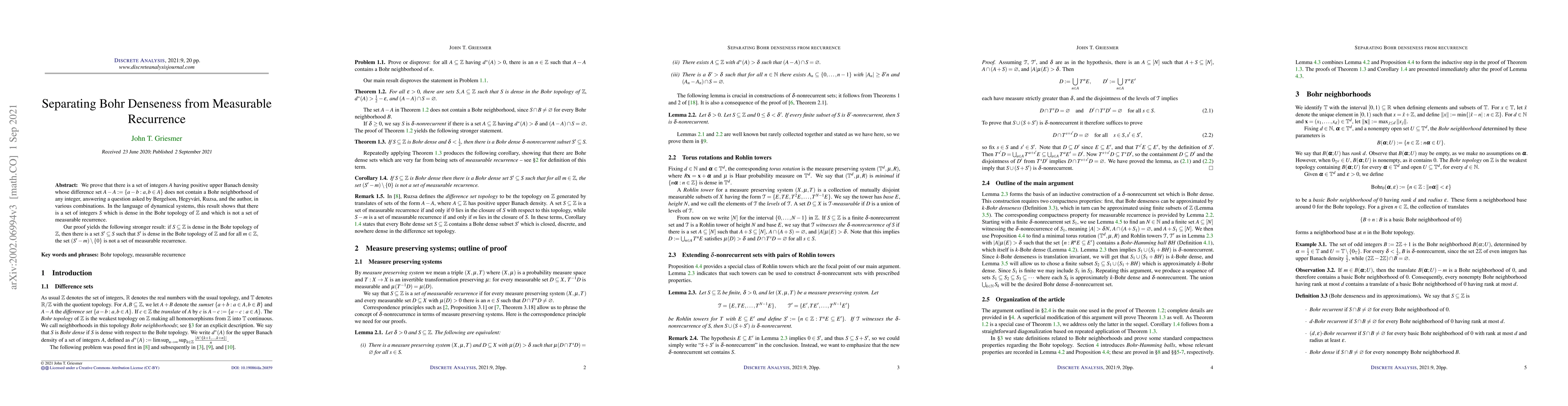 The paper proves the existence of a set of integers with positive upper Banach density whose difference set avoids Bohr neighborhoods, separating Bohr density from measurable recurrence. It also shows that any set dense in the Bohr topology can be refined to a subset where shifted difference sets exclude measurable recurrence.