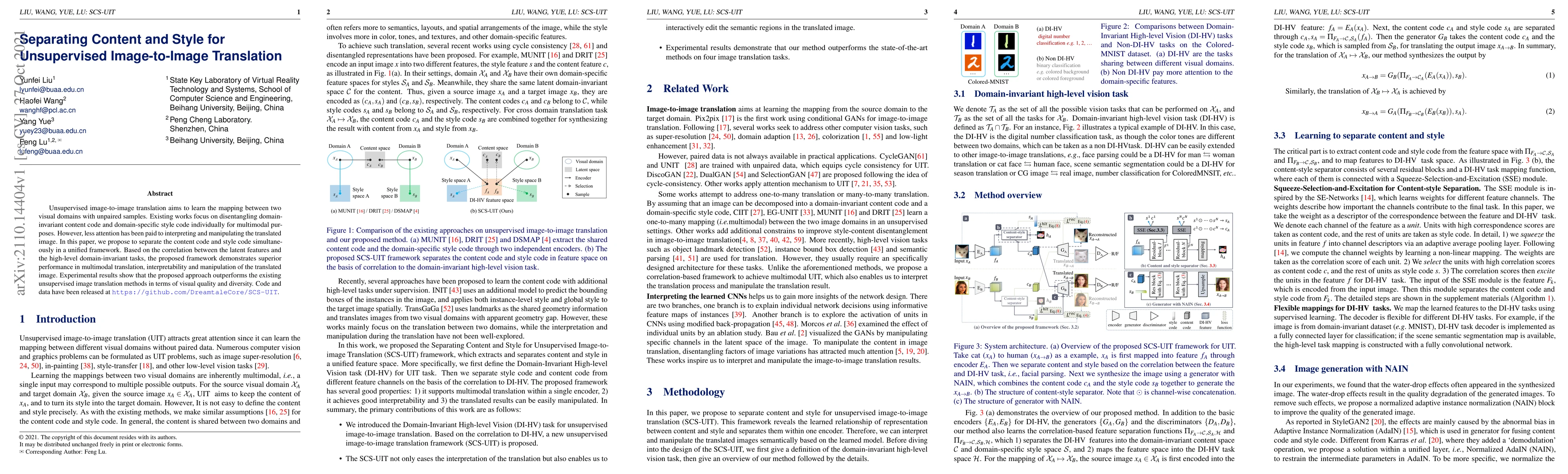 This paper proposes a unified framework for unsupervised image-to-image translation that simultaneously disentangles content and style codes, enhancing multimodal translation, interpretability, and manipulation of translated images. Experimental results indicate superior performance in visual quality and diversity compared to existing methods.