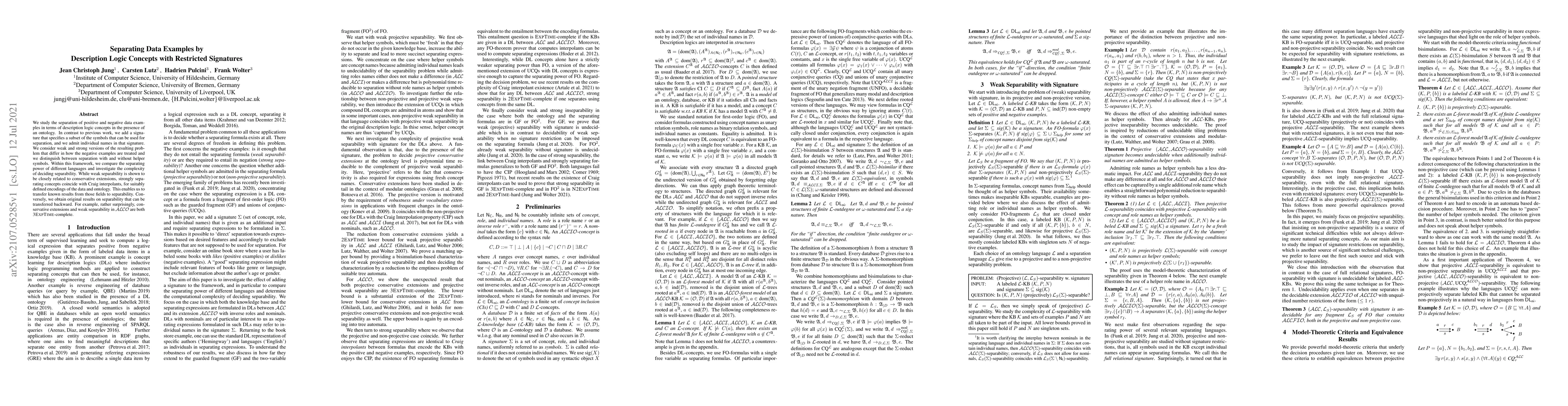 We study the separation of positive and negative data examples in terms of description logic concepts in the presence of an ontology. In contrast to previous work, we add a signature that specifies a subset of the symbols that can be used for separation, and we admit individual names in that signature. We consider weak and strong versions of the resulting problem that differ in how the negative examples are treated and we distinguish between separation with and without helper symbols. Within this framework, we compare the separating power of different languages and investigate the complexity of deciding separability. While weak separability is shown to be closely related to conservative extensions, strongly separating concepts coincide with Craig interpolants, for suitably defined encodings of the data and ontology. This enables us to transfer known results from those fields to separability. Conversely, we obtain original results on separability that can be transferred backward. For example, rather surprisingly, conservative extensions and weak separability in ALCO are both 3ExpTime-complete.