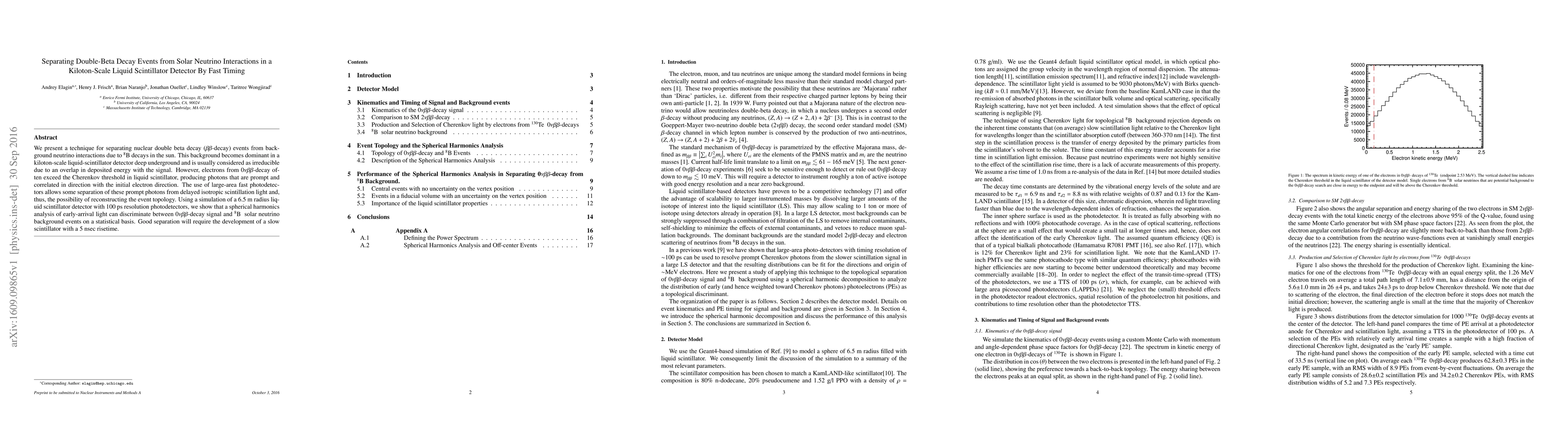 This paper proposes a method to distinguish double-beta decay events from solar neutrino interactions in a kiloton-scale liquid scintillator detector using fast timing and large-area fast photodetectors. The technique relies on the prompt Cherenkov photons from double-beta decay exceeding the threshold, allowing for event topology reconstruction and statistical discrimination against the background.
