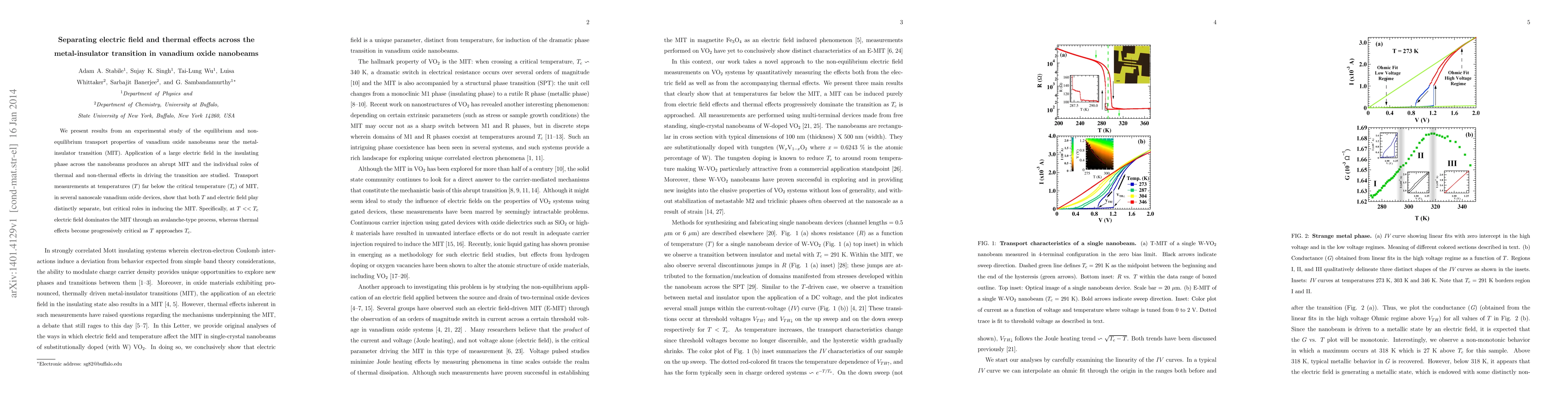 This study experimentally investigates the transport properties of vanadium oxide nanobeams near the metal-insulator transition, revealing that electric fields induce an abrupt transition in the insulating phase, while thermal effects become significant as temperature approaches the critical transition point.