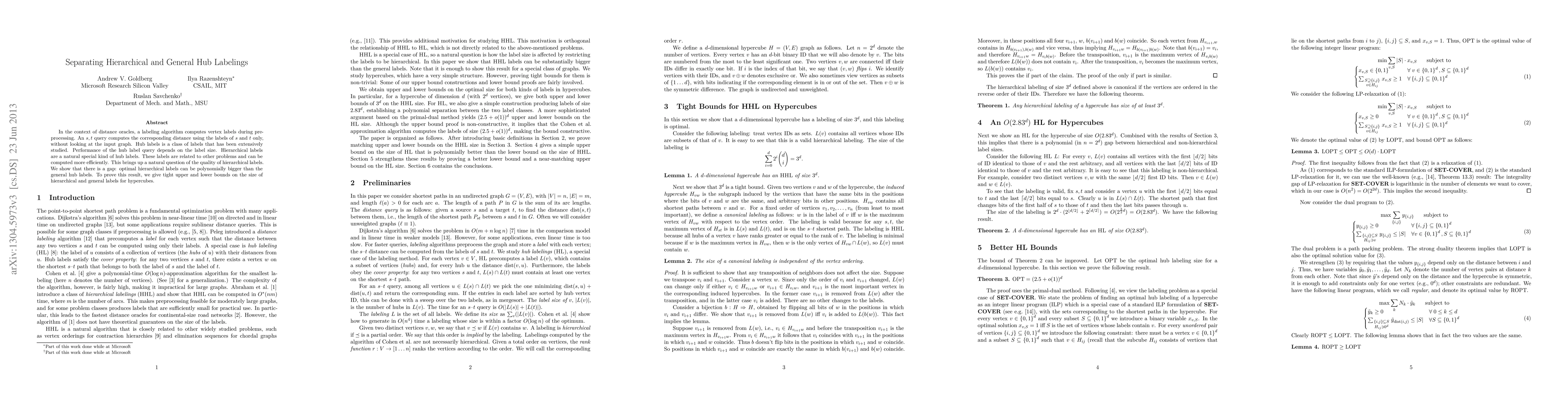 This paper investigates the differences in performance between hierarchical and general hub labelings in distance oracles, showing that optimal hierarchical labels can be polynomially larger than general hub labels. The study provides tight bounds on label sizes for hypercubes to demonstrate this gap.