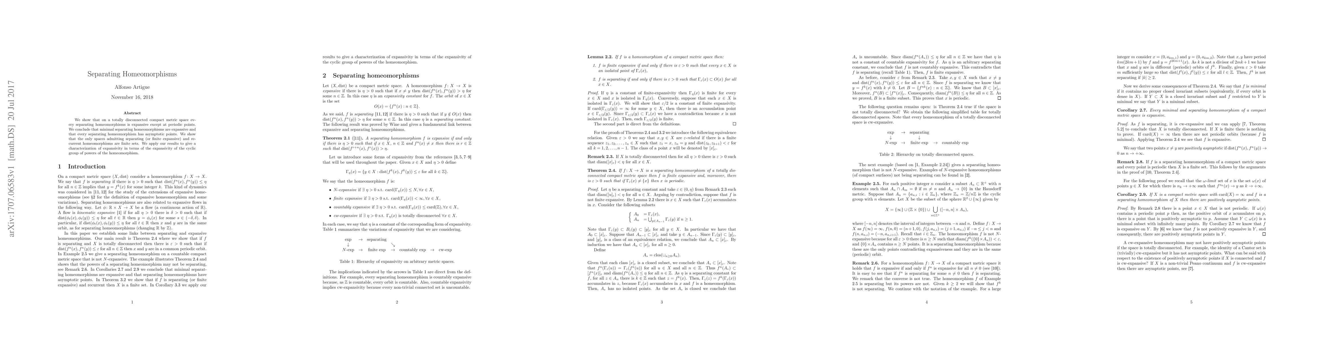 This paper demonstrates that on totally disconnected compact metric spaces, separating homeomorphisms are expansive except at periodic points, leading to the conclusion that minimal separating homeomorphisms are expansive and that all such homeomorphisms have asymptotic points. It also proves that only finite sets can admit both separating and recurrent homeomorphisms. The study concludes with a characterization of expansivity linked to the cyclic group of powers of the homeomorphism.