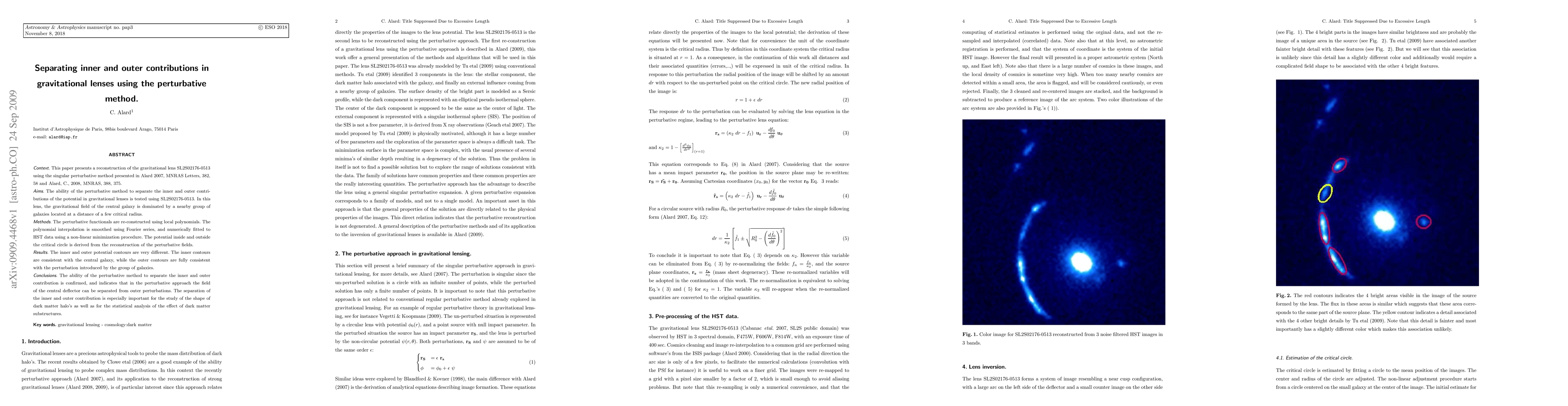This paper presents a reconstruction of the gravitational lens SL2S02176-0513 using the singular perturbative method presented in Alard 2007, MNRAS Letters, 382, 58 and Alard, C., 2008, MNRAS, 388, 375. The ability of the perturbative method to separate the inner and outer contributions of the potential in gravitational lenses is tested using SL2S02176-0513. In this lens, the gravitational field of the central galaxy is dominated by a nearby group of galaxies located at a distance of a few critical radius. The perturbative functionals are re-constructed using local polynomials. The polynomial interpolation is smoothed using Fourier series, and numerically fitted to HST data using a non-linear minimization procedure. The potential inside and outside the critical circle is derived from the reconstruction of the perturbative fields. The inner and outer potential contours are very different.The inner contours are consistent with the central galaxy, while the outer contours are fully consistent with the perturbation introduced by the group of galaxies. The ability of the perturbative method to separate the inner and outer contribution is confirmed, and indicates that in the perturbative approach the field of the central deflector can be separated from outer perturbations. The separation of the inner and outer contribution is especially important for the study of the shape of dark matter halo's as well as for the statistical analysis of the effect of dark matter substructures.