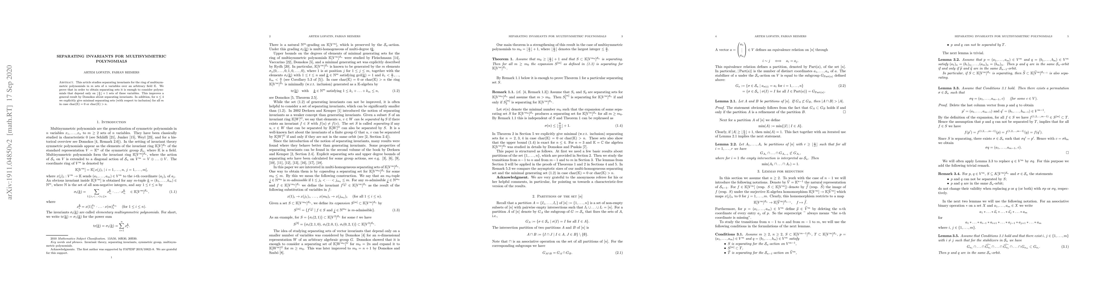 This paper explores separating invariants for multisymmetric polynomials, proving that only polynomials depending on $\lfloor \frac{n}{2} \rfloor + 1$ sets of variables are needed, which improves Domokos's result. For $n \leq 4$, it provides explicit minimal separating sets when the field's characteristic is zero or greater than $n$.