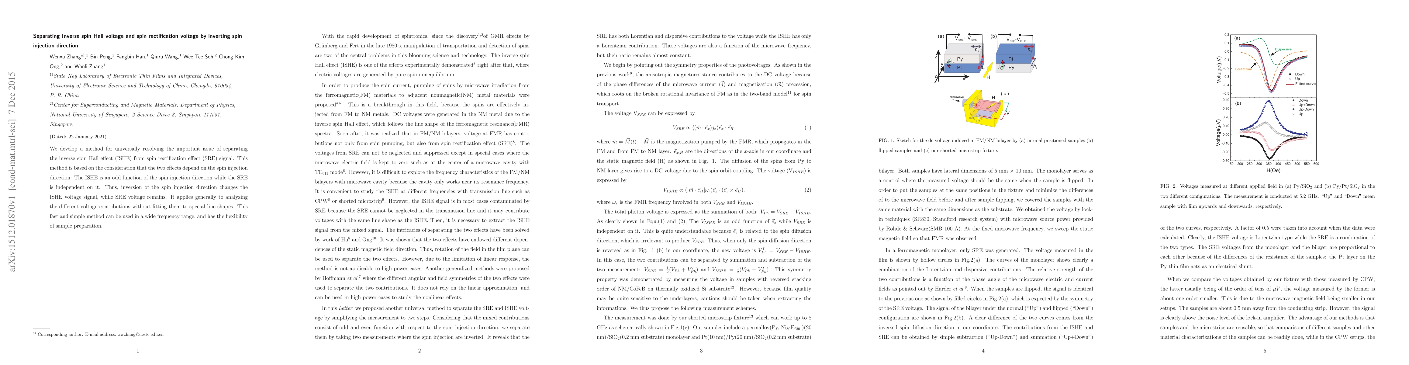 We develop a method for universally resolving the important issue of separating the inverse spin Hall effect (ISHE) from spin rectification effect (SRE) signal. This method is based on the consideration that the two effects depend on the spin injection direction: The ISHE is an odd function of the spin injection direction while the SRE is independent on it. Thus, inversion of the spin injection direction changes the ISHE voltage signal, while SRE voltage remains. It applies generally to analyzing the different voltage contributions without fitting them to special line shapes. This fast and simple method can be used in a wide frequency range, and has the flexibility of sample preparation.