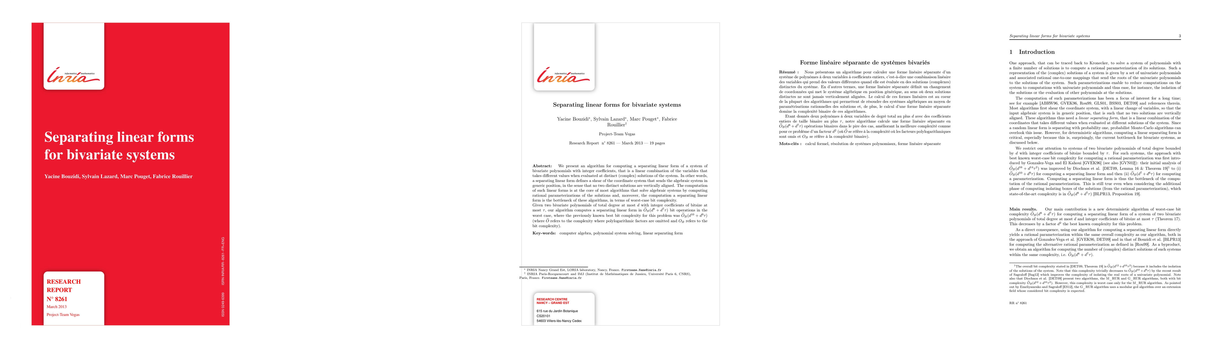 This paper presents an algorithm to compute a separating linear form for bivariate polynomial systems, significantly reducing the worst-case bit complexity from $\sOB(d^{10}+d^9\tau)$ to $\sOB(d^{8}+d^7\tau)$. This improvement is crucial for solving algebraic systems through rational parameterizations.