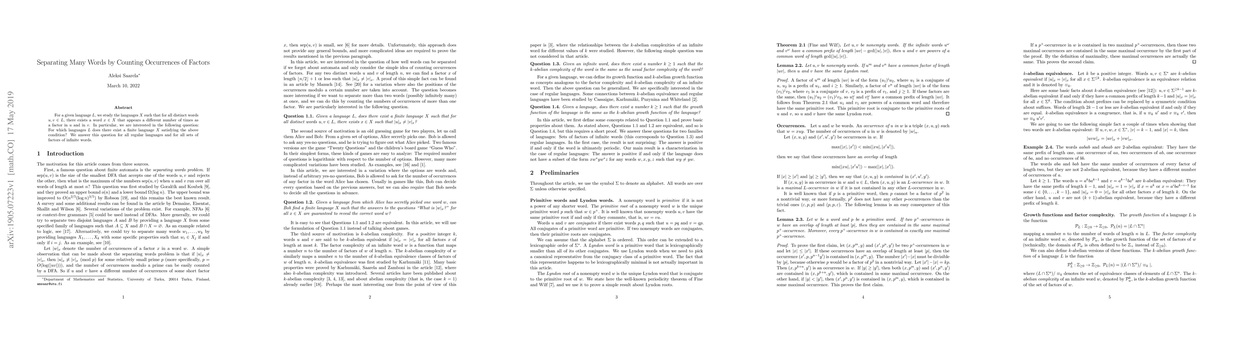 For a given language $L$, we study the languages $X$ such that for all distinct words $u, v \in L$, there exists a word $x \in X$ that appears a different number of times as a factor in $u$ and in $v$. In particular, we are interested in the following question: For which languages $L$ does there exist a finite language $X$ satisfying the above condition? We answer this question for all regular languages and for all sets of factors of infinite words.