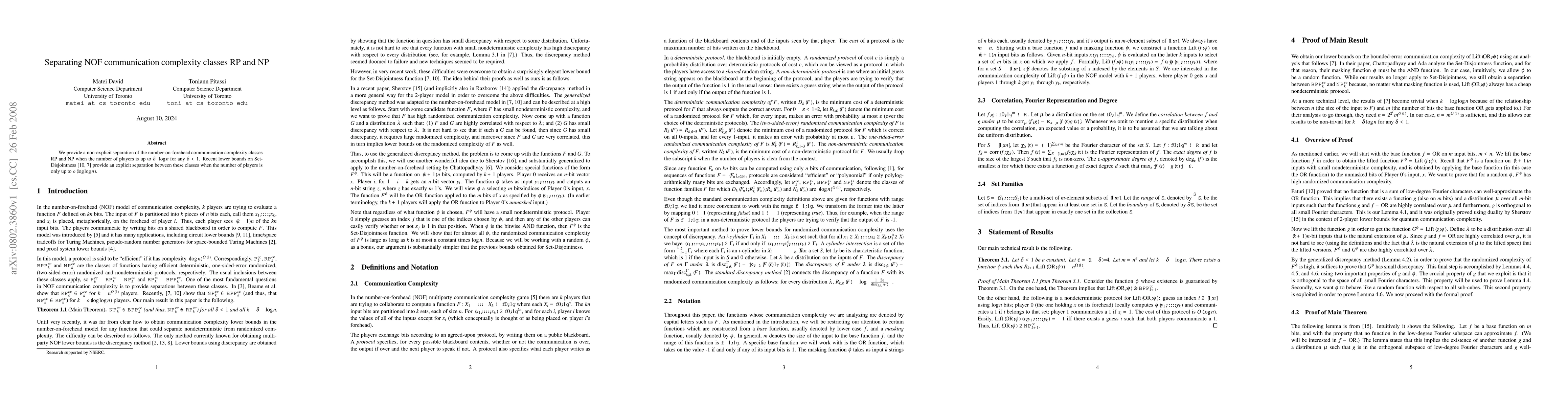 This paper presents a non-explicit separation of RP and NP in number-on-forehead communication complexity for up to δ log(n) players, where δ < 1. This result extends beyond the explicit separation provided by recent lower bounds on Set-Disjointness for fewer players.