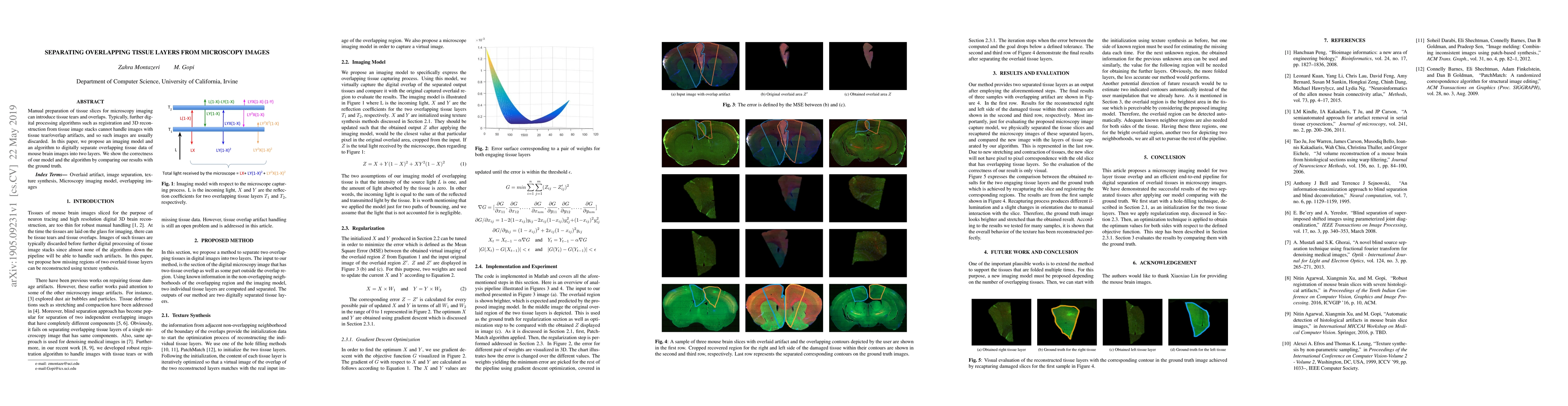 Manual preparation of tissue slices for microscopy imaging can introduce tissue tears and overlaps. Typically, further digital processing algorithms such as registration and 3D reconstruction from tissue image stacks cannot handle images with tissue tear/overlap artifacts, and so such images are usually discarded. In this paper, we propose an imaging model and an algorithm to digitally separate overlapping tissue data of mouse brain images into two layers. We show the correctness of our model and the algorithm by comparing our results with the ground truth.