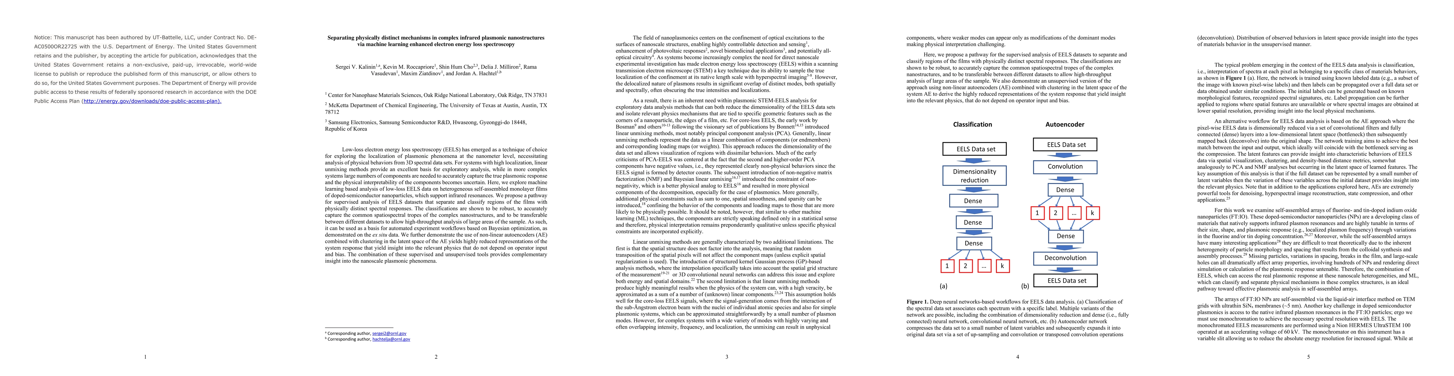 Low-loss electron energy loss spectroscopy (EELS) has emerged as a technique of choice for exploring the localization of plasmonic phenomena at the nanometer level, necessitating analysis of physical behaviors from 3D spectral data sets. For systems with high localization, linear unmixing methods provide an excellent basis for exploratory analysis, while in more complex systems large numbers of components are needed to accurately capture the true plasmonic response and the physical interpretability of the components becomes uncertain. Here, we explore machine learning based analysis of low-loss EELS data on heterogeneous self-assembled monolayer films of doped-semiconductor nanoparticles, which support infrared resonances. We propose a pathway for supervised analysis of EELS datasets that separate and classify regions of the films with physically distinct spectral responses. The classifications are shown to be robust, to accurately capture the common spatiospectral tropes of the complex nanostructures, and to be transferable between different datasets to allow high-throughput analysis of large areas of the sample. As such, it can be used as a basis for automated experiment workflows based on Bayesian optimization, as demonstrated on the ex situ data. We further demonstrate the use of non-linear autoencoders (AE) combined with clustering in the latent space of the AE yields highly reduced representations of the system response that yield insight into the relevant physics that do not depend on operator input and bias. The combination of these supervised and unsupervised tools provides complementary insight into the nanoscale plasmonic phenomena.