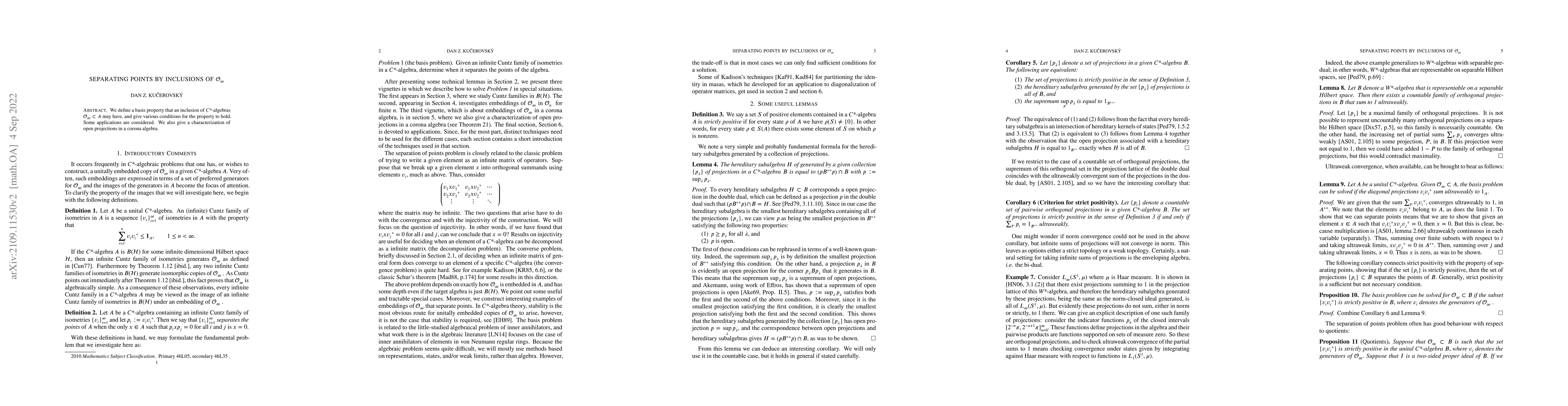 We define a basis property that an inclusion of C*-algebras $\mathcal O_\infty\subset A$ may have, and give various conditions for the property to hold. Some applications are considered. We also give a characterization of open projections in a corona algebra.