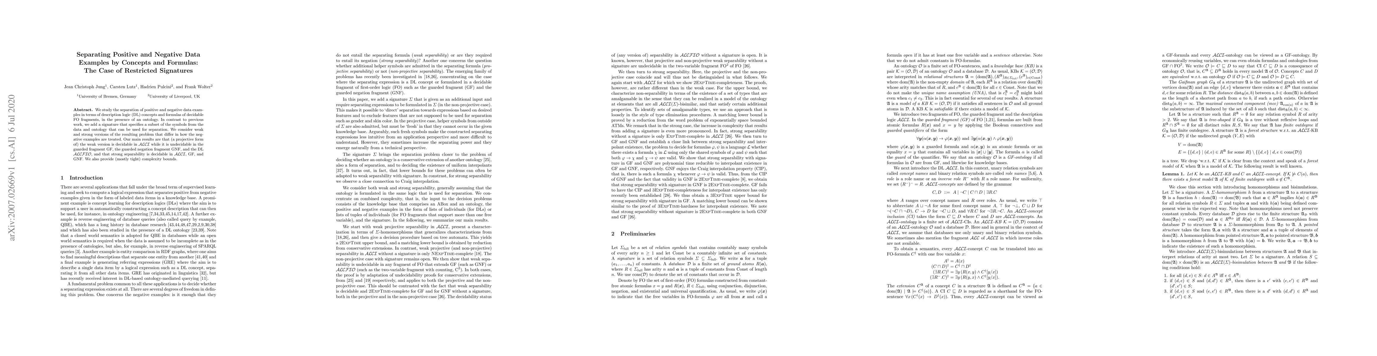 We study the separation of positive and negative data examples in terms of description logic (DL) concepts and formulas of decidable FO fragments, in the presence of an ontology. In contrast to previous work, we add a signature that specifies a subset of the symbols from the data and ontology that can be used for separation. We consider weak and strong versions of the resulting problem that differ in how the negative examples are treated. Our main results are that (a projective form of) the weak version is decidable in $\mathcal{ALCI}$ while it is undecidable in the guarded fragment GF, the guarded negation fragment GNF, and the DL $\mathcal{ALCFIO}$, and that strong separability is decidable in $\mathcal{ALCI}$, GF, and GNF. We also provide (mostly tight) complexity bounds.
