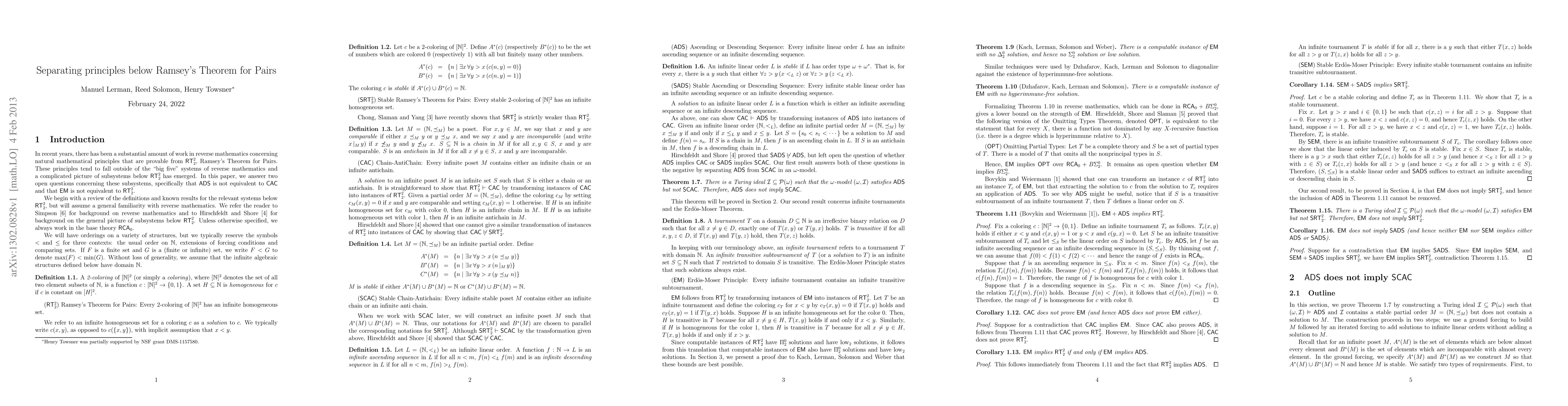 This paper addresses open questions in reverse mathematics by demonstrating that $\ADS$ is not equivalent to $\CAC$ and $\EM$ is not equivalent to $\RT$, thus refining the understanding of subsystems beneath Ramsey's Theorem for Pairs.