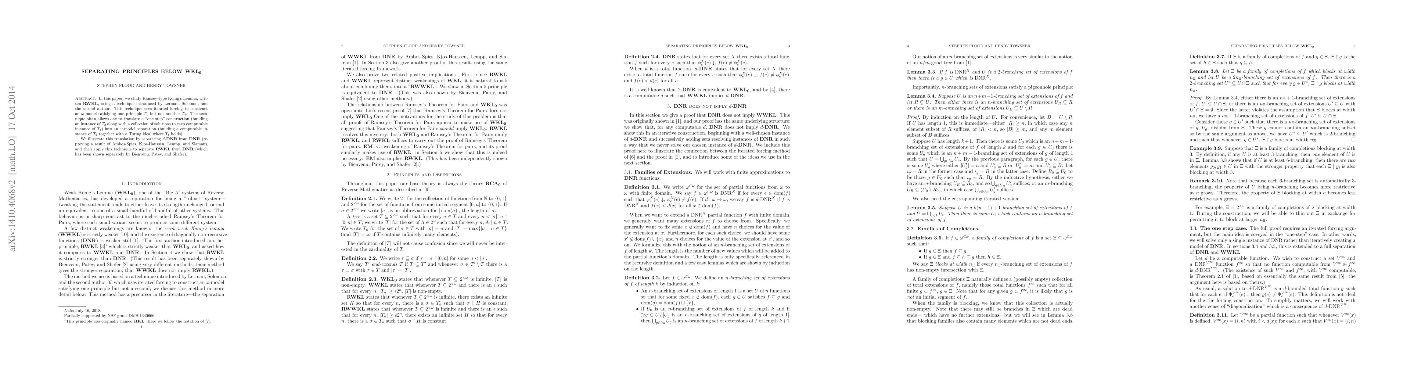 In this paper, we study Ramsey-type Konig's Lemma, written RWKL, using a technique introduced by Lerman, Solomon, and the second author. This technique uses iterated forcing to construct an omega-model satisfying one principle T_1 but not another T_2. The technique often allows one to translate a "one step" construction (building an instance of T_2 along with a collection of solutions to each computable instance of T_1) into an omega-model separation (building a computable instance of T_2 together with a Turing ideal where T_1 holds). We illustrate this translation by separating d-DNR from DNR (reproving a result of Ambos-Spies, Kjos-Hanssen, Lempp, and Slaman), and then apply this technique to separate RWKL$ from DNR (which has been shown separately by Bienvenu, Patey, and Schafer).
