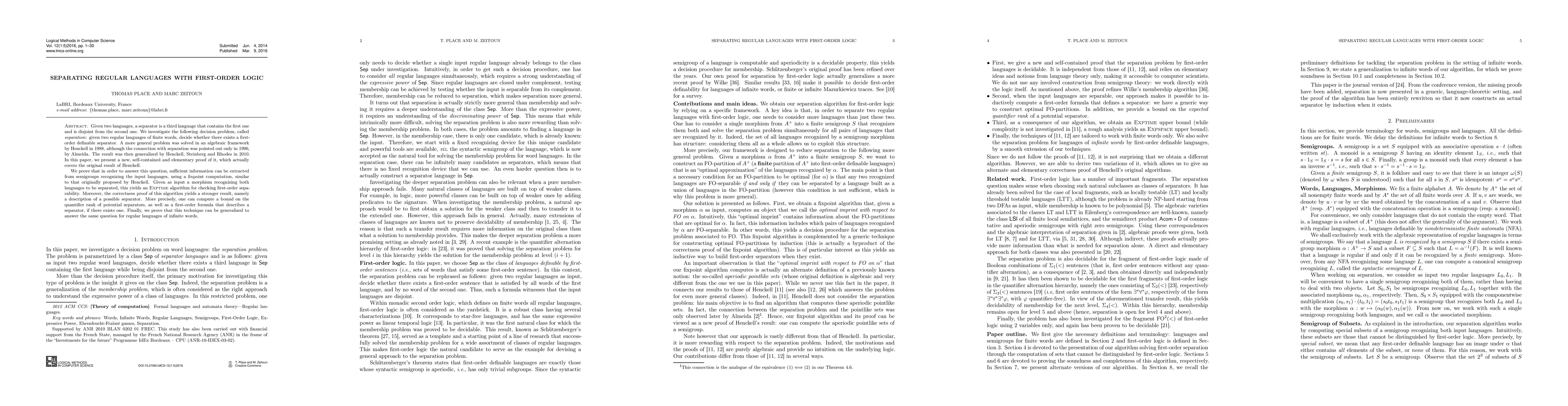 The paper develops an EXPTIME algorithm to determine if two regular languages have a first-order definable separator, offering insights into the separability of finite-word regular languages.