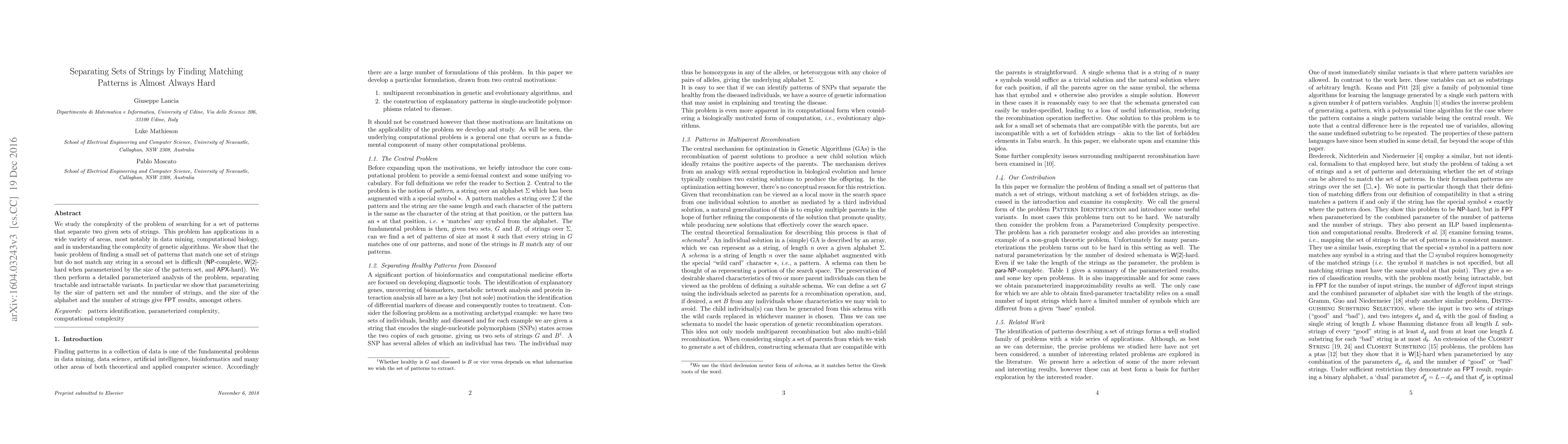 We study the complexity of the problem of searching for a set of patterns that separate two given sets of strings. This problem has applications in a wide variety of areas, most notably in data mining, computational biology, and in understanding the complexity of genetic algorithms. We show that the basic problem of finding a small set of patterns that match one set of strings but do not match any string in a second set is difficult (NP-complete, W[2]-hard when parameterized by the size of the pattern set, and APX-hard). We then perform a detailed parameterized analysis of the problem, separating tractable and intractable variants. In particular we show that parameterizing by the size of pattern set and the number of strings, and the size of the alphabet and the number of strings give FPT results, amongst others.