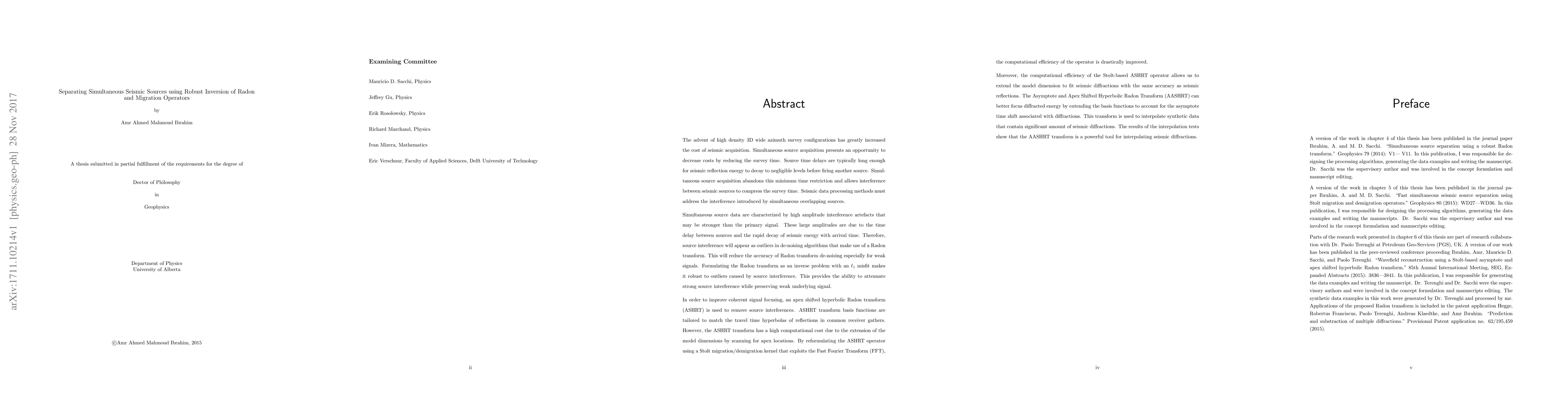 The advent of high density 3D wide azimuth survey configurations has greatly increased the cost of seismic acquisition. Simultaneous source acquisition presents an opportunity to decrease costs by reducing the survey time. Source time delays are typically long enough for seismic reflection energy to decay to negligible levels before firing another source. Simultaneous source acquisition abandons this minimum time restriction and allows interference between seismic sources to compress the survey time. Seismic data processing methods must address the interference introduced by simultaneous overlapping sources. Simultaneous source data are characterized by high amplitude interference artefacts that may be stronger than the primary signal. These large amplitudes are due to the time delay between sources and the rapid decay of seismic energy with arrival time. Therefore, source interference will appear as outliers in denoising algorithms that make use of a Radon transform. This will reduce the accuracy of Radon transform de-noising especially for weak signals. Formulating the Radon transform as an inverse problem with an L1 misfit makes it robust to outliers caused by source interference. This provides the ability to attenuate strong source interference while preserving weak underlying signal. In order to improve coherent signal focusing, an apex shifted hyperbolic Radon transform (ASHRT) is used to remove source interferences. ASHRT transform basis functions are tailored to match the travel time hyperbolas of reflections in common receiver gathers. However, the ASHRT transform has a high computational cost due to the extension of the model dimensions by scanning for apex locations. By reformulating the ASHRT operator using a Stolt migration/demigration kernel that exploits the Fast Fourier Transform (FFT), the computational efficiency of the operator is drastically improved.