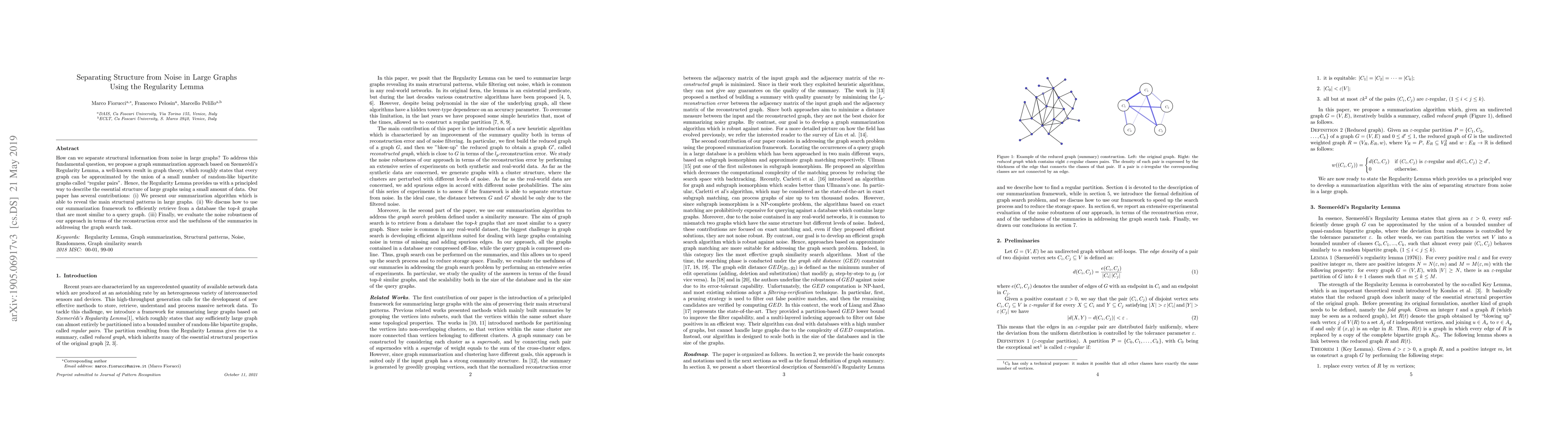 How can we separate structural information from noise in large graphs? To address this fundamental question, we propose a graph summarization approach based on Szemer\'edi's Regularity Lemma, a well-known result in graph theory, which roughly states that every graph can be approximated by the union of a small number of random-like bipartite graphs called `regular pairs'. Hence, the Regularity Lemma provides us with a principled way to describe the essential structure of large graphs using a small amount of data. Our paper has several contributions: (i) We present our summarization algorithm which is able to reveal the main structural patterns in large graphs. (ii) We discuss how to use our summarization framework to efficiently retrieve from a database the top-k graphs that are most similar to a query graph. (iii) Finally, we evaluate the noise robustness of our approach in terms of the reconstruction error and the usefulness of the summaries in addressing the graph search task.