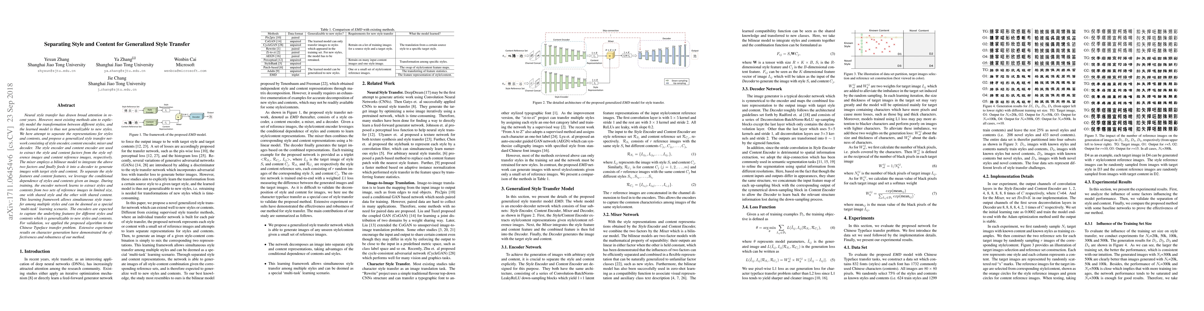 This paper proposes a generalized style transfer network that separates style and content features to enable transfer to new styles without retraining. The method uses style and content encoders, a mixer, and a decoder to generate images with target style and content, validated through Chinese Typeface transfer with successful results.