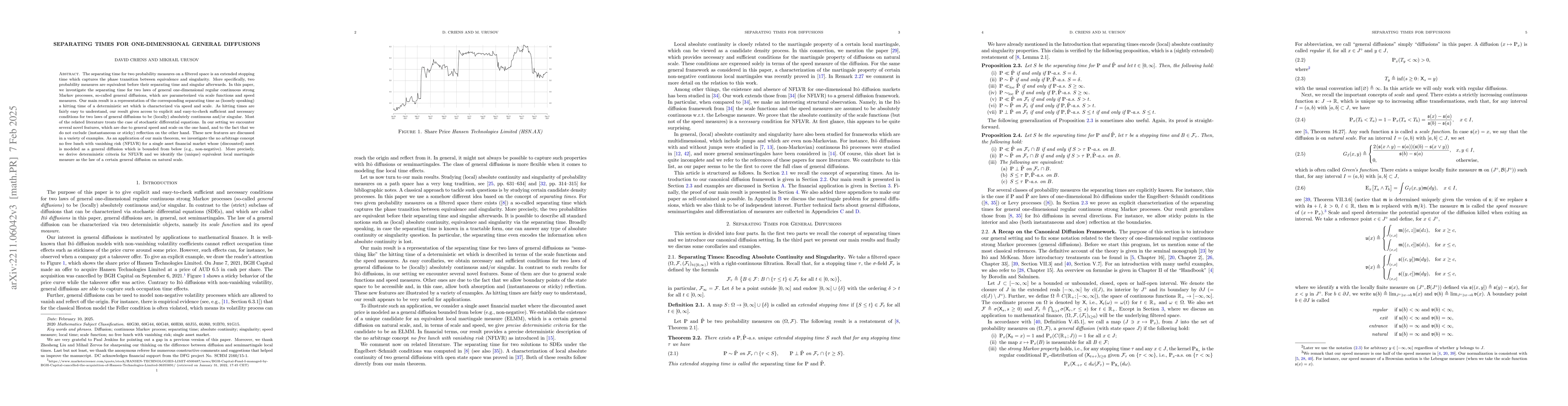 This paper investigates the separating time for two laws of general one-dimensional diffusions, representing it as a hitting time of a deterministic set characterized by speed and scale functions. The study provides explicit criteria for determining the absolute continuity or singularity of these laws, and applies the findings to derive deterministic criteria for the no arbitrage concept in financial markets.