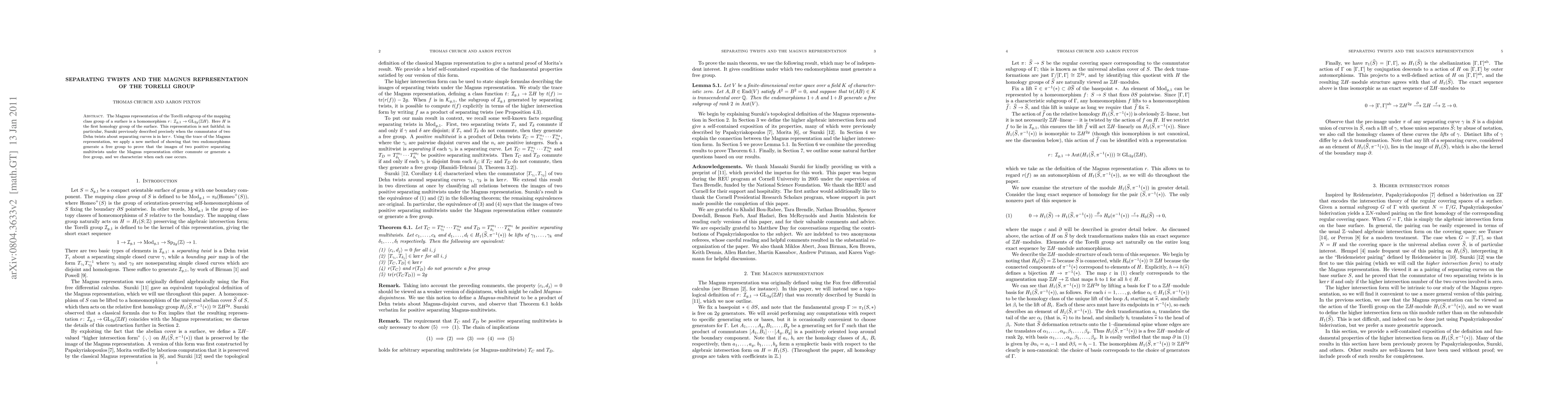 This paper explores the Magnus representation of the Torelli group, revealing that images of separating multitwists either commute or generate a free group, with a new method using trace to determine the exact conditions for each case.
