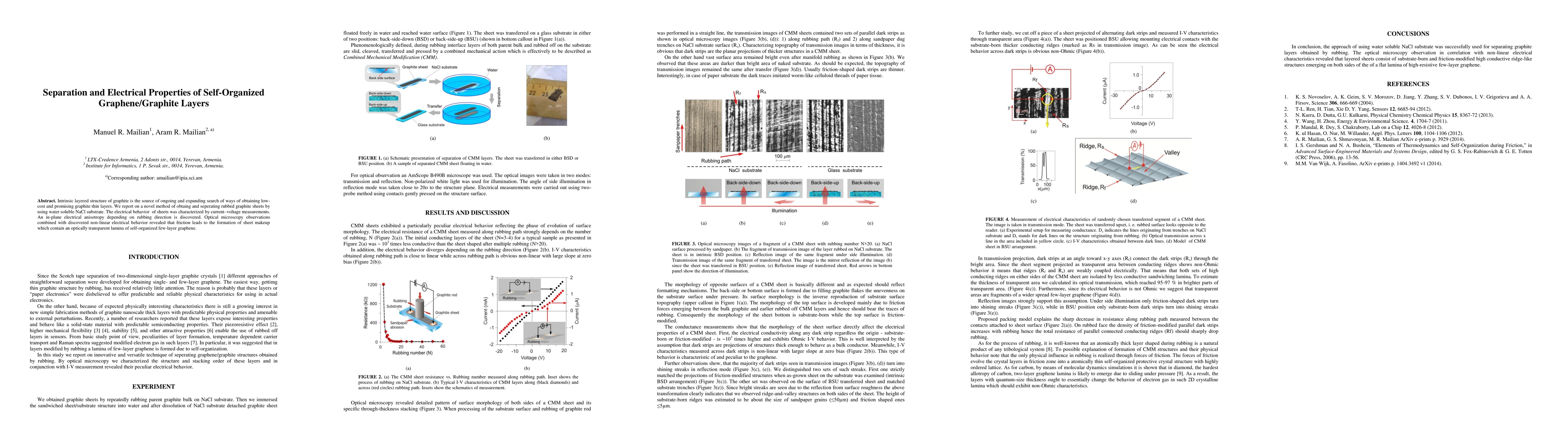 This paper presents a novel method for separating thin graphite layers using a water-soluble NaCl substrate, revealing an in-plane electrical unisotropy. The study finds that friction creates self-organized few-layer graphene sheets with an optically transparent lamina, demonstrating non-linear electrical behavior.