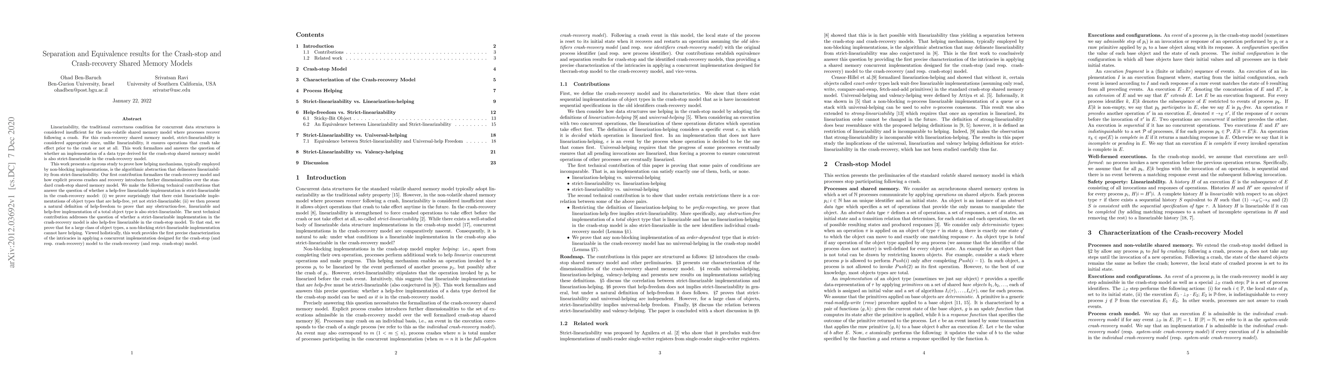 This paper investigates the equivalence between linearizability and strict-linearizability in crash-stop versus crash-recovery shared memory models, proving that strict-linearizability is independent of help mechanisms. It formalizes the crash-recovery model and demonstrates that help-free, linearizable implementations are also strict-linearizable, providing a nuanced understanding of concurrent data structures' behavior in crash recovery scenarios.