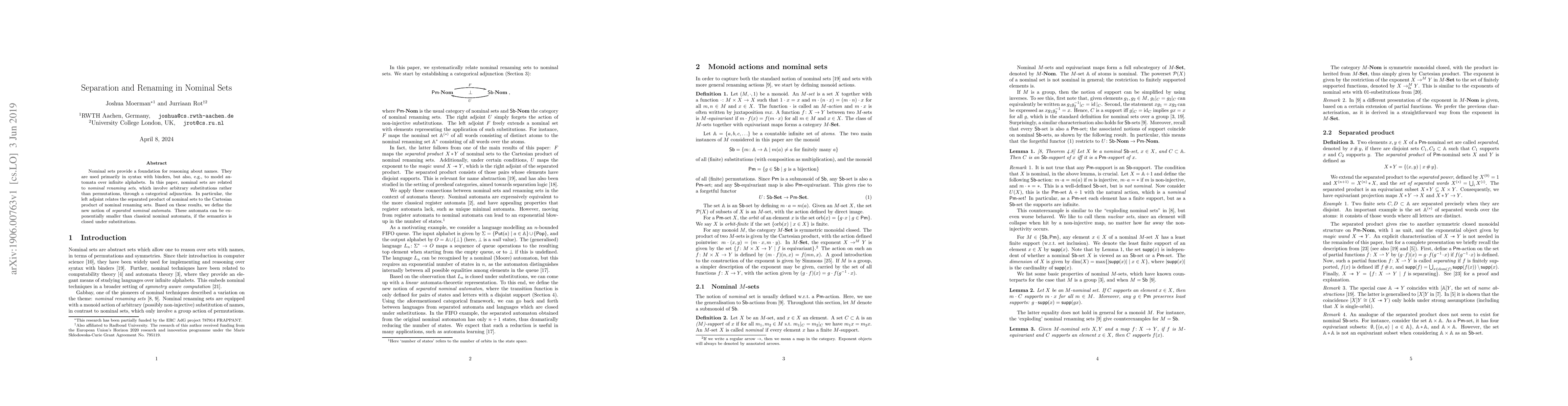 This paper explores the relationship between nominal sets and nominal renaming sets via a categorical adjunction, introducing separated nominal automata that are exponentially smaller than classical nominal automata under certain semantic conditions.