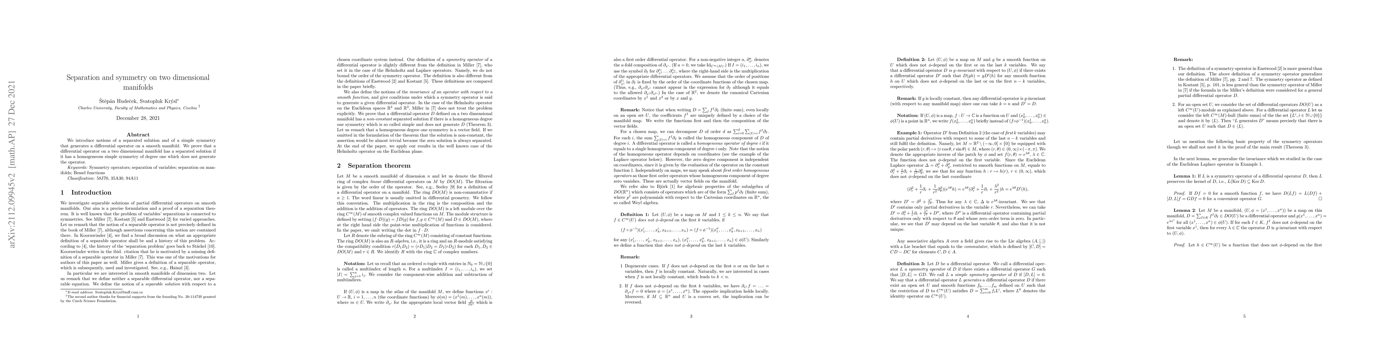 This paper introduces the concepts of 'separated solutions' and 'simple symmetries' of degree one for differential operators on 2D manifolds. It proves that a 2D manifold's differential operator possesses a separated solution if it has a homogeneous simple symmetry of degree one that doesn't create the operator itself.