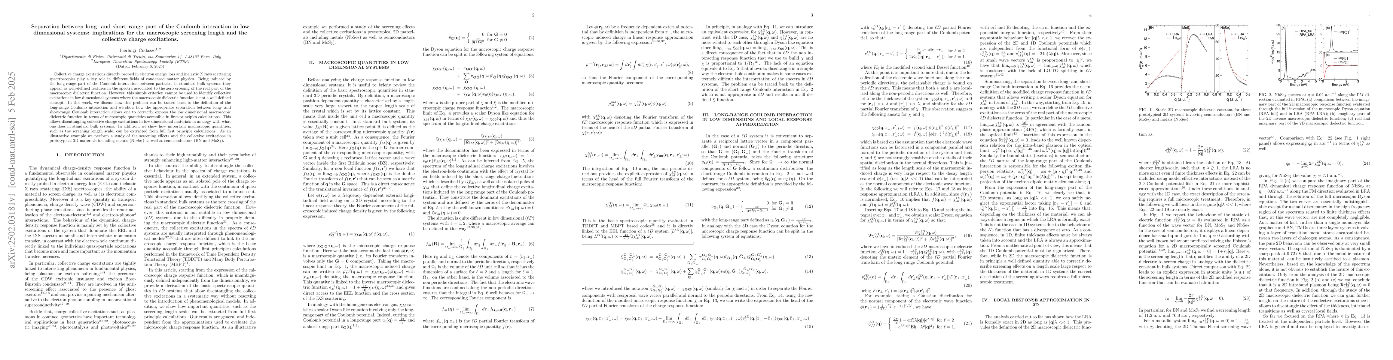 The paper introduces a method to separate long- and short-range Coulomb interactions in low-dimensional systems, enabling the definition of a macroscopic dielectric function and the identification of collective charge excitations through a scalar Dyson equation.