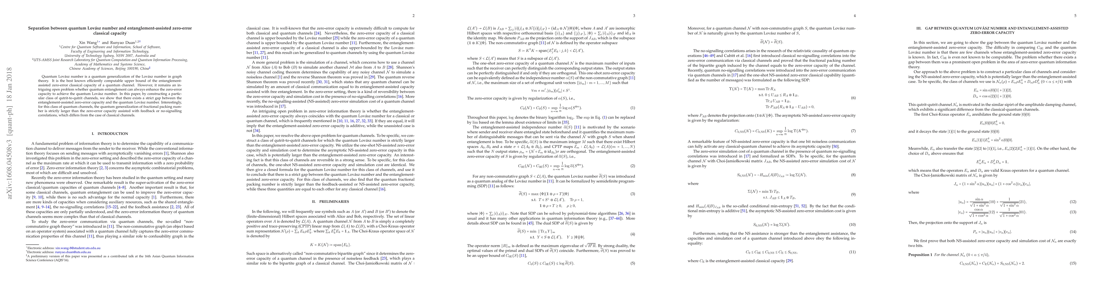 This paper demonstrates a strict separation between the quantum Lov\'asz number and the entanglement-assisted zero-error classical capacity for a specific class of qutrit-to-qutrit channels, indicating that quantum entanglement does not always enhance the capacity to reach the quantum Lov\'asz number. It also reveals that the quantum generalization of fractional packing number exceeds the zero-error capacity for these channels, contrasting with classical channels.