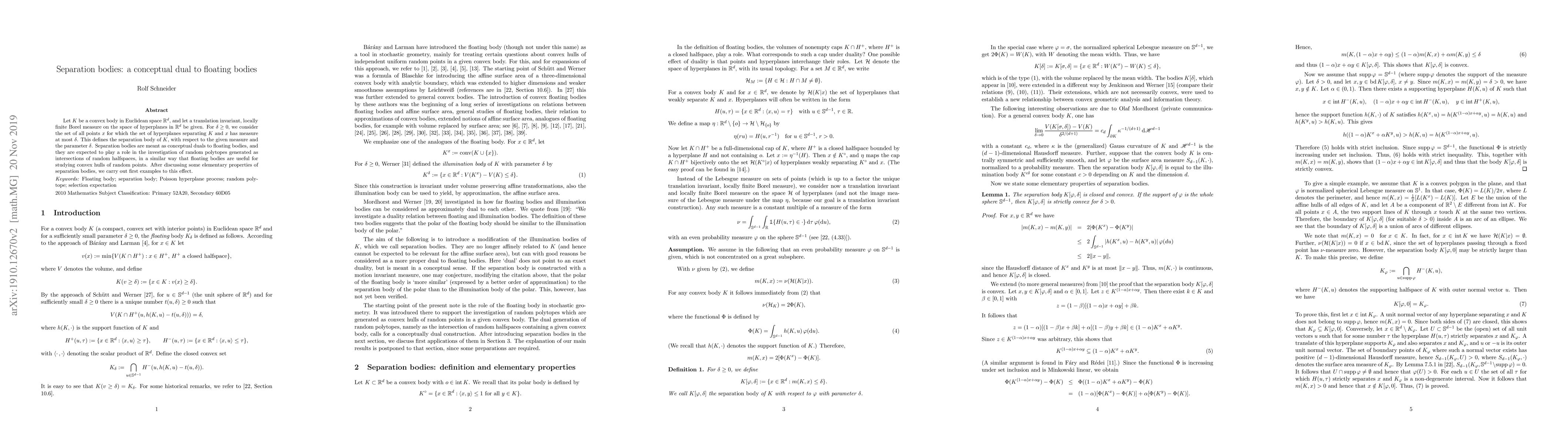 This paper introduces separation bodies as a conceptual dual to floating bodies, defined as the set of points separated from a convex body by hyperplanes with a specified measure. It explores their properties and potential applications in studying random polytopes formed by intersecting random halfspaces.